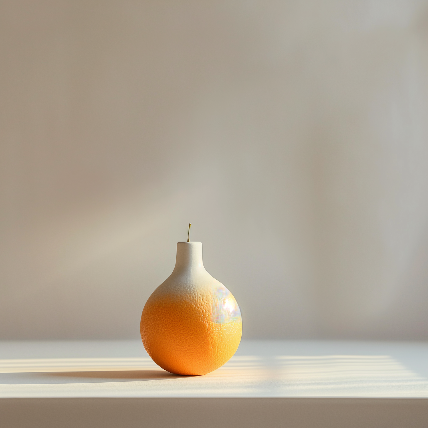 Minimalist vase with orange texture and white top in soft lighting, creating a striking contrast on a plain background.