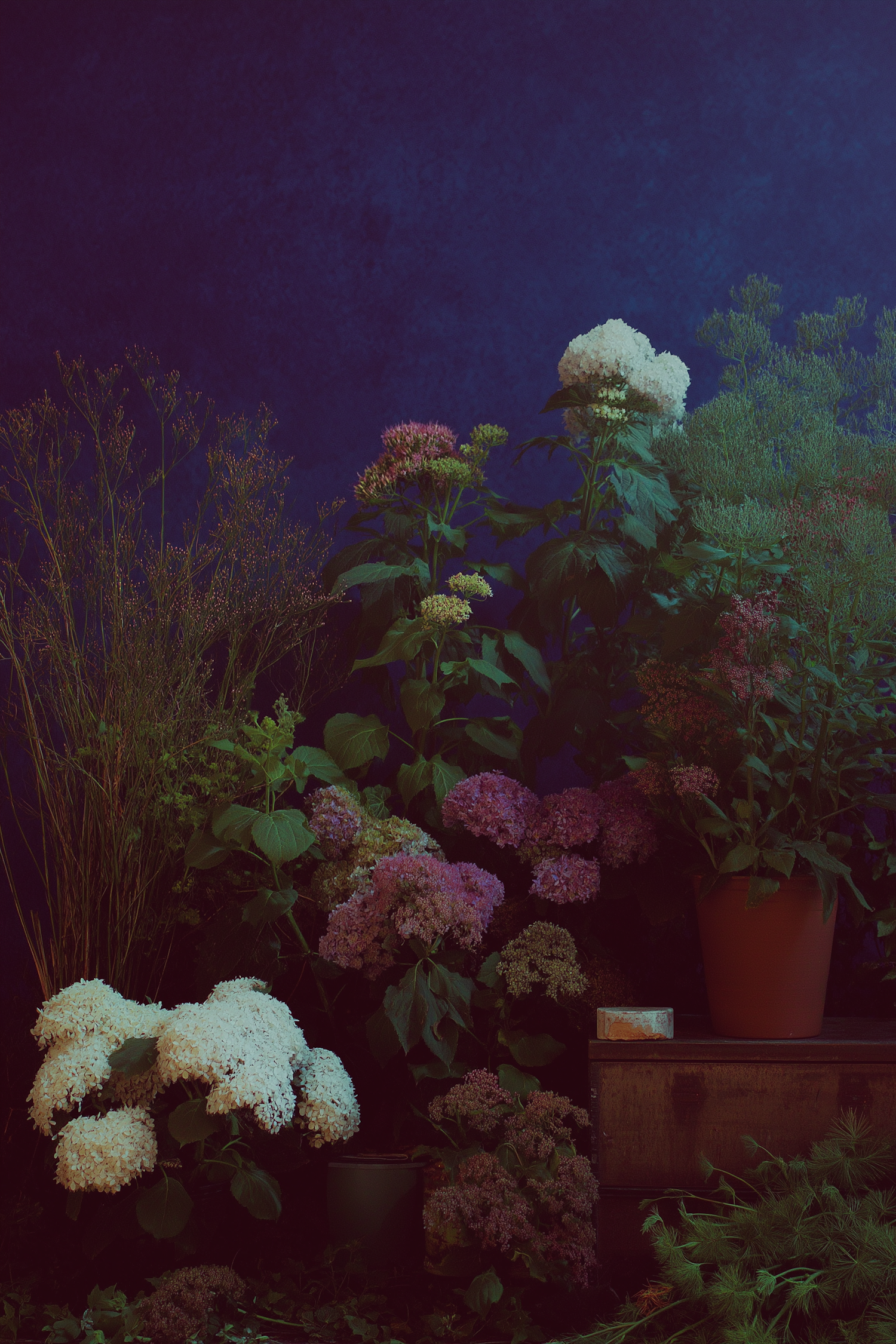 Vibrant arrangement of hydrangeas blending white and pink hues, enhanced by lush greenery and a striking deep blue backdrop.