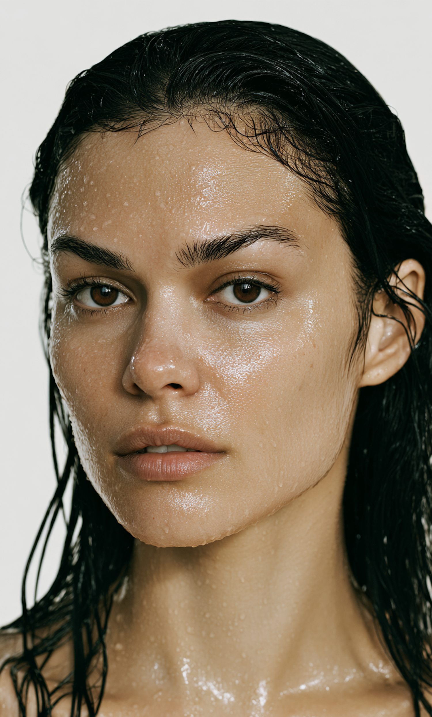 A close-up image of a person with wet hair and skin, showcasing their natural look and fresh, hydrated appearance.