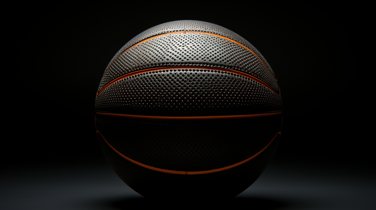 Dramatic close-up of a basketball with textured surface and orange seams against a dark background, highlighting its details.