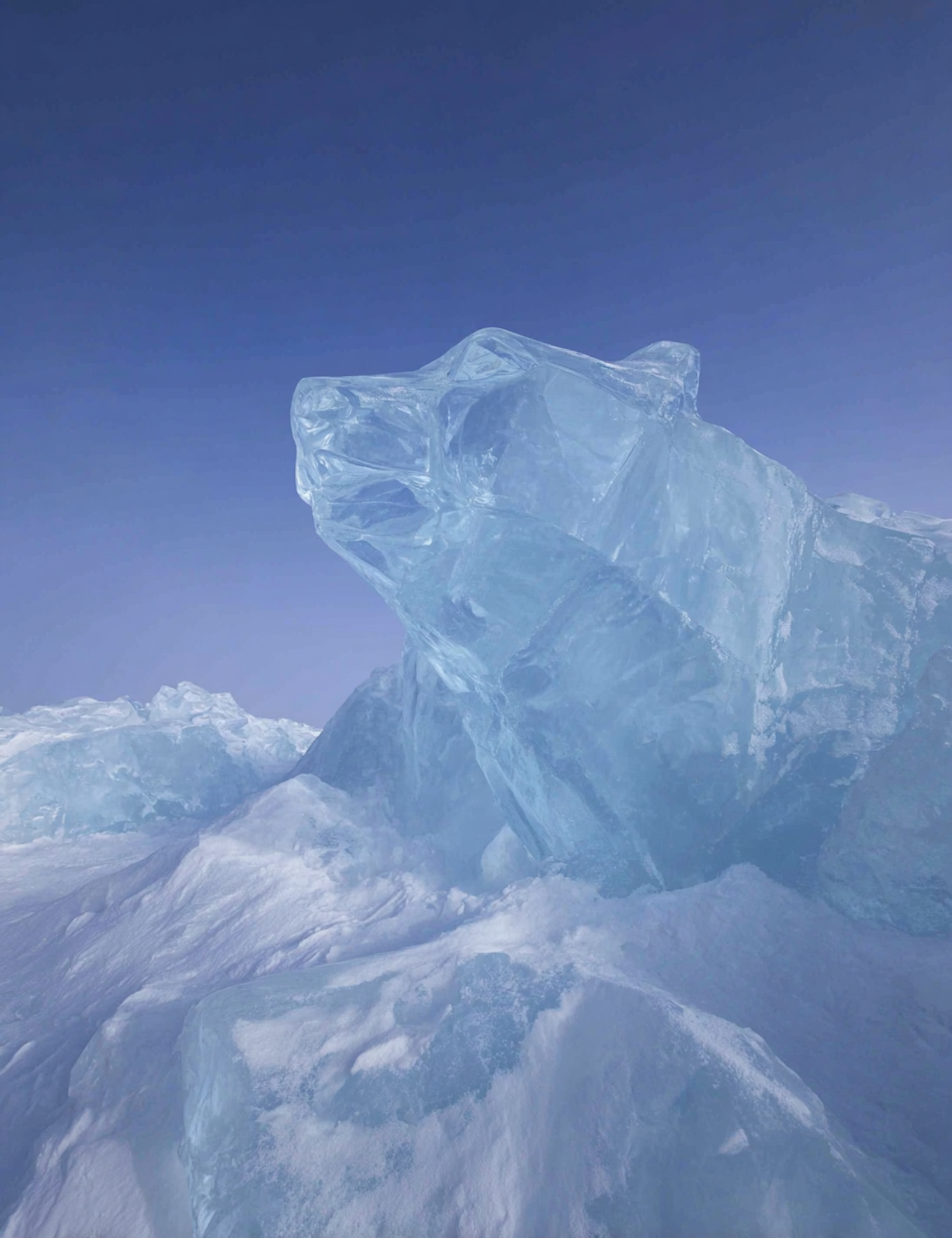 A breathtaking ice sculpture of a bear's head in a snowy landscape under a clear blue sky, showcasing intricate details and natural beauty.