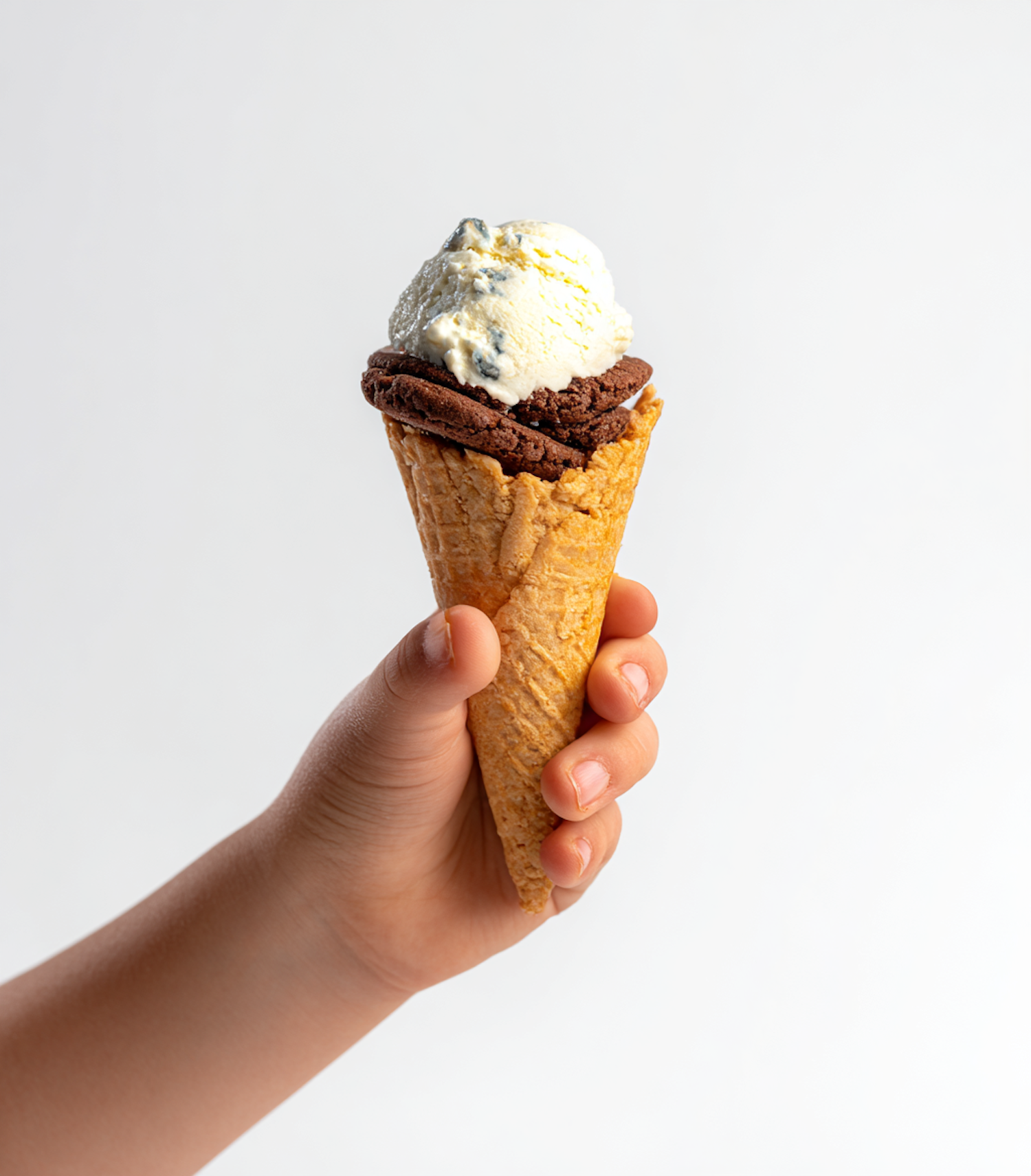 A hand holds an ice cream cone with a scoop of vanilla ice cream topped on a chocolate base, set against a plain white background.