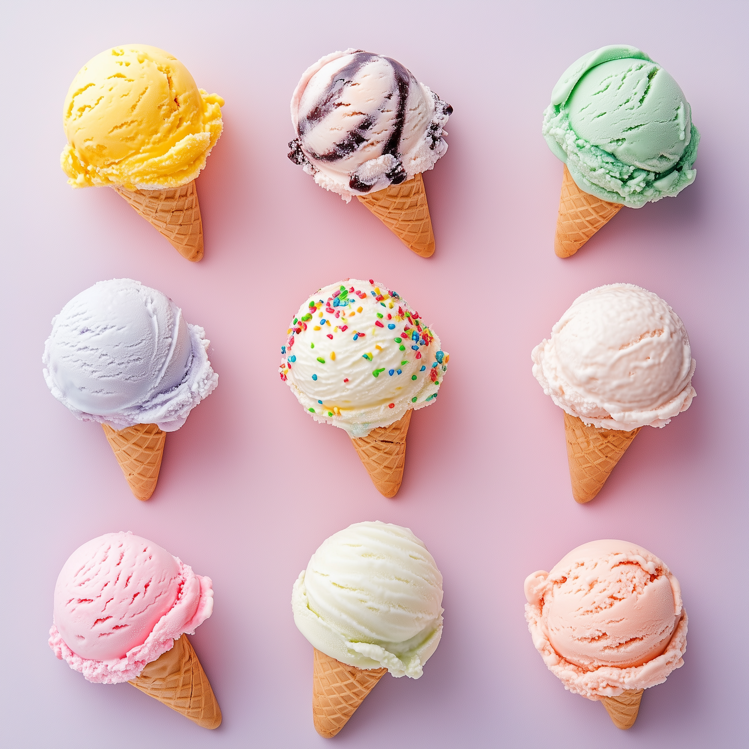 A colorful grid of nine ice cream cones with various flavors on a pink background, featuring sprinkles and vibrant pastel tones.