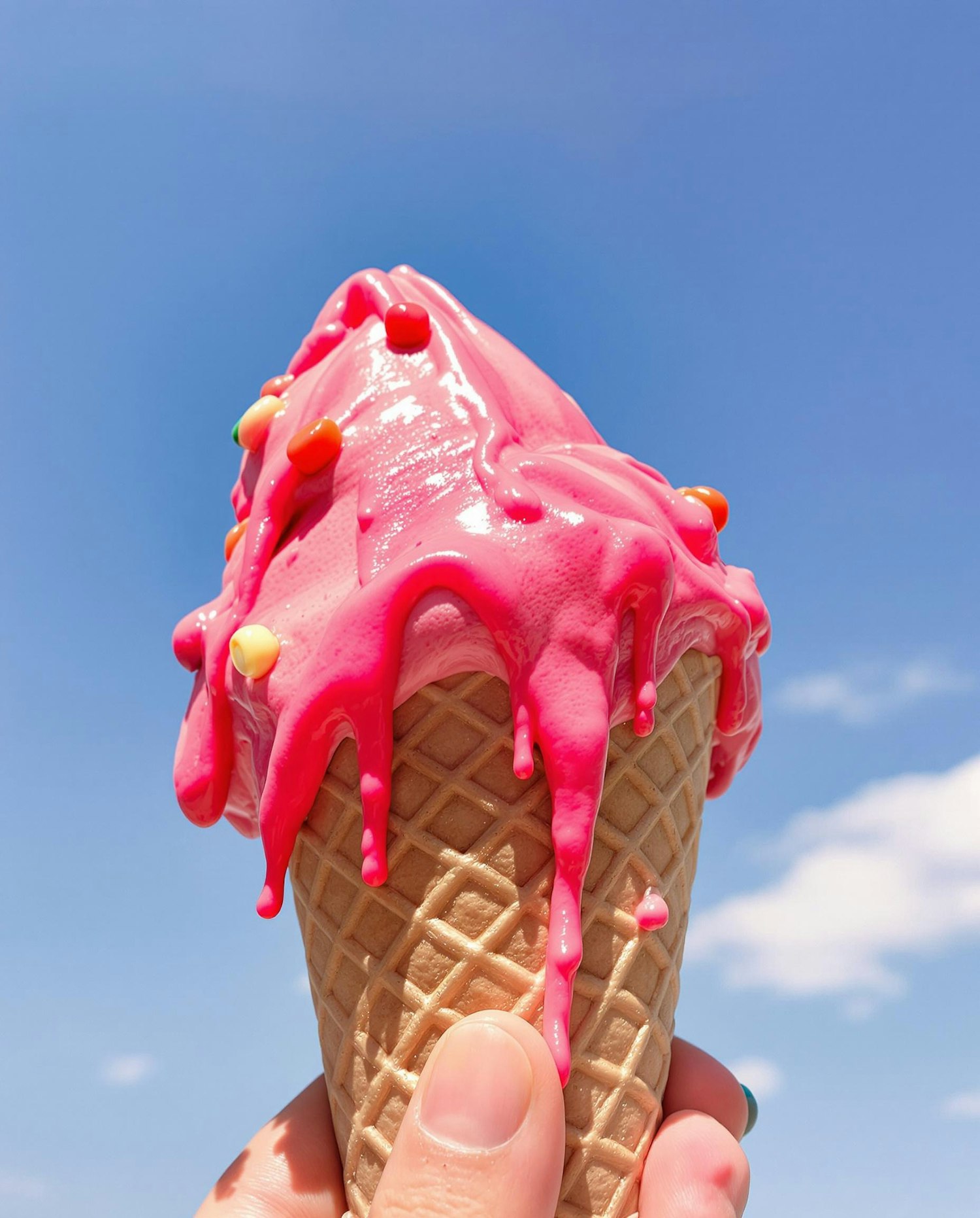 Bright pink ice cream with colorful candies melting on a waffle cone against a sunny blue sky. Perfect summer vibes!