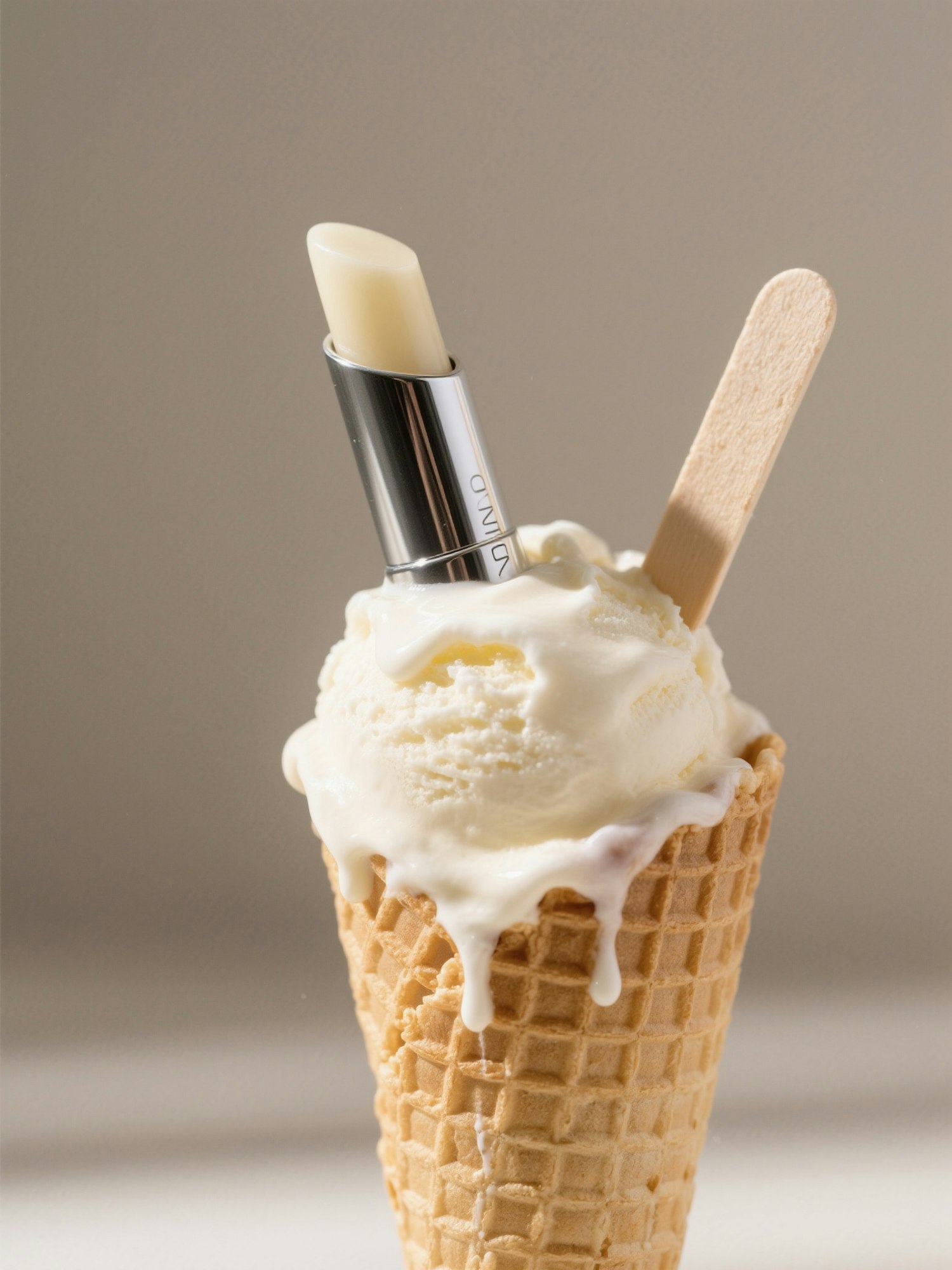 A fun and creative image of a vanilla ice cream cone with a lipstick tube and a wooden stick inserted, blending beauty and dessert themes.