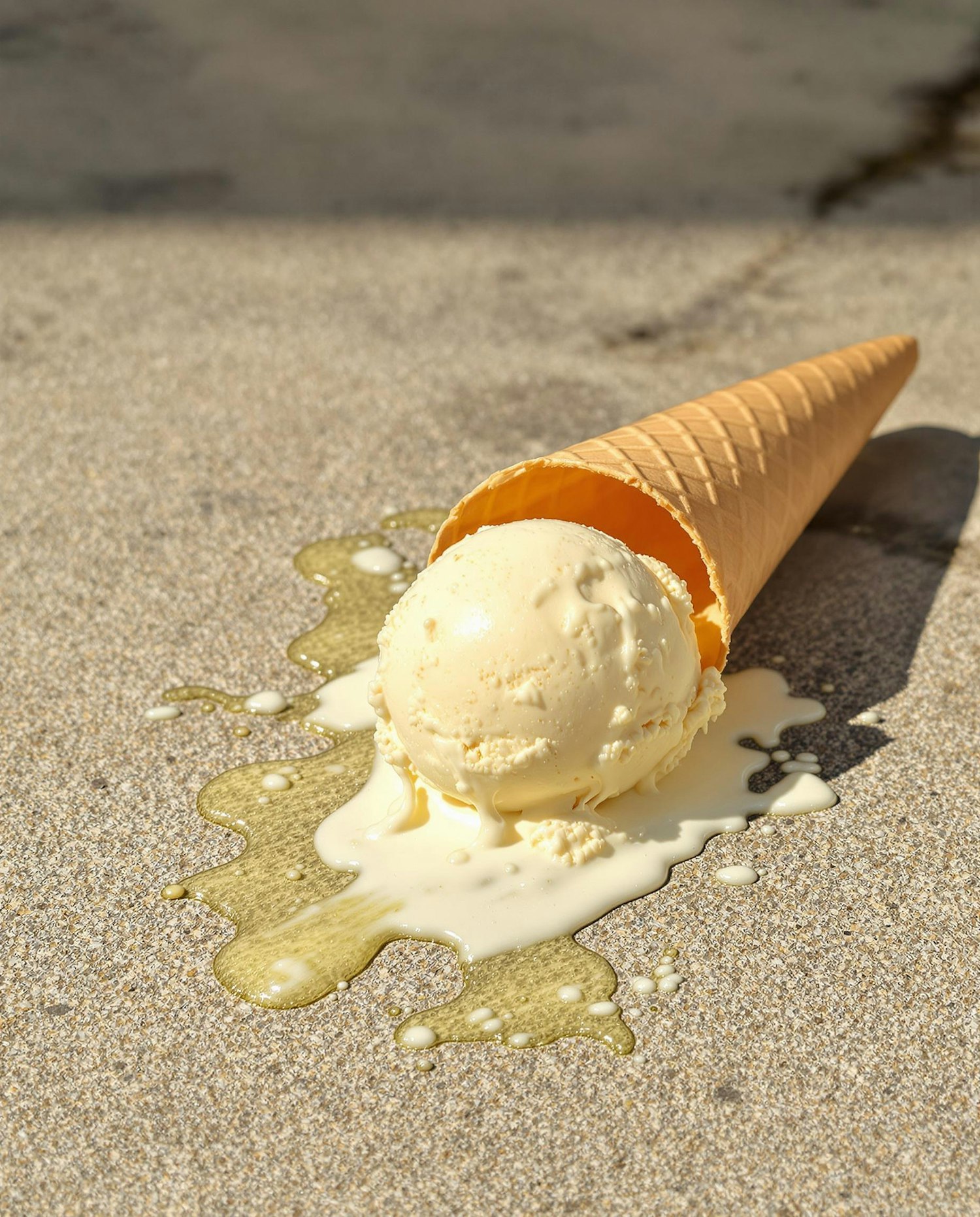 A dropped vanilla ice cream cone melting under the sun on a textured surface, showing an inevitable and relatable summer mishap.