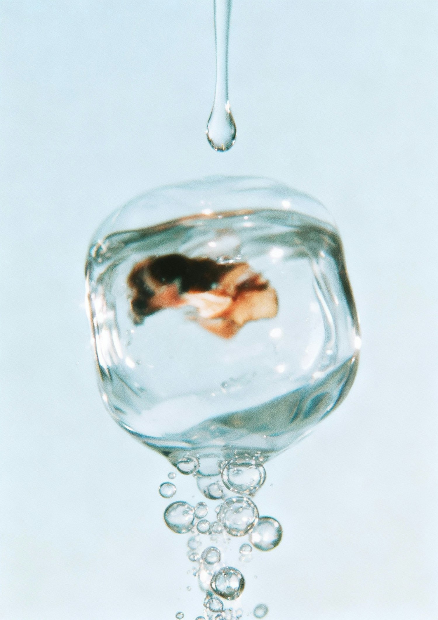 A close-up of an ice cube with a figure inside, surrounded by bubbles and a falling water droplet, set against a light blue background.