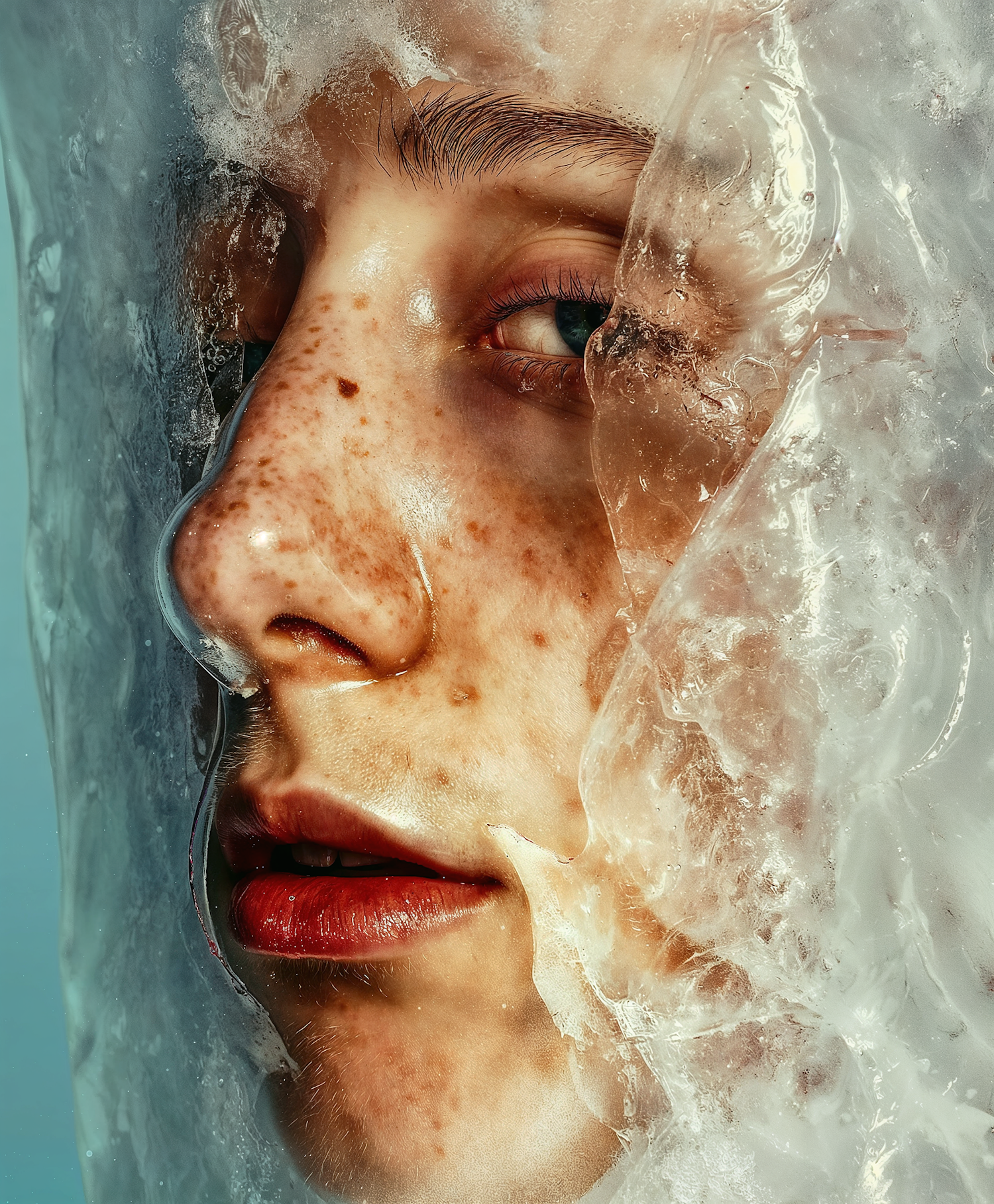 Close-up of a freckled face partially covered in ice, highlighting blue eyes and parted lips. Surreal and artistic composition.