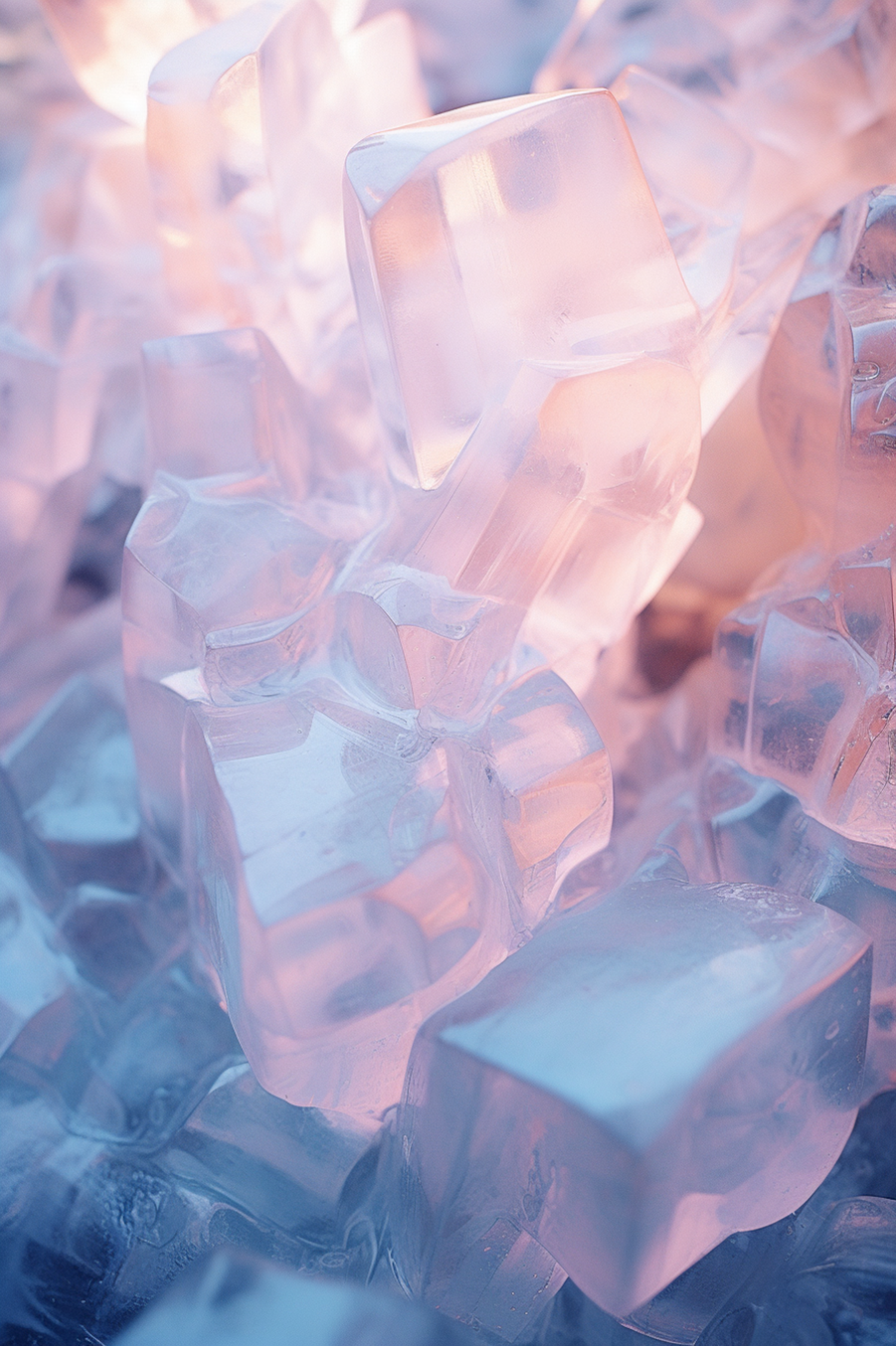 Close-up of ice cubes with a pinkish glow, creating a striking contrast of warmth and cold.