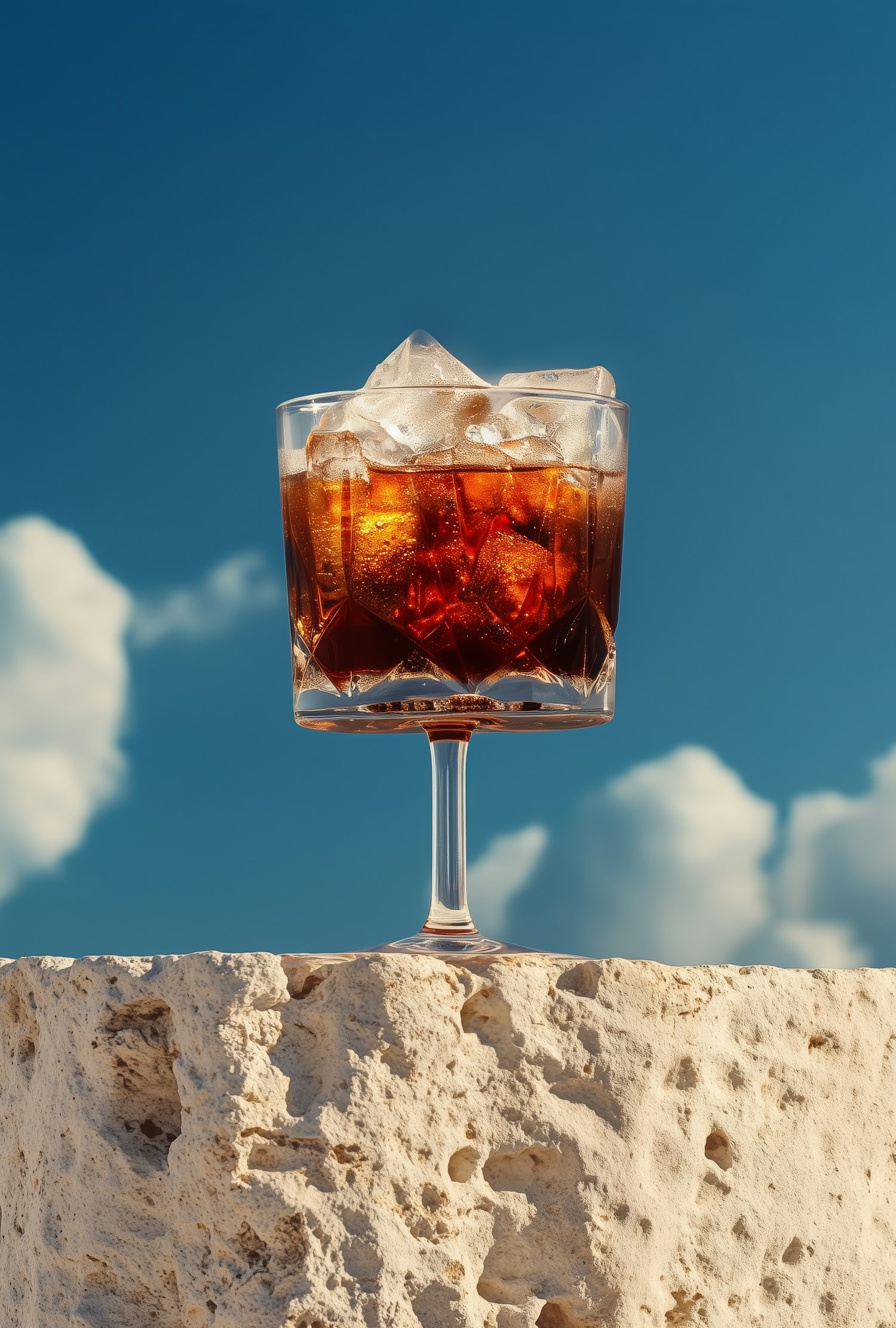 A refreshing iced drink in a faceted glass on a stone surface, set against a clear blue sky with soft clouds.