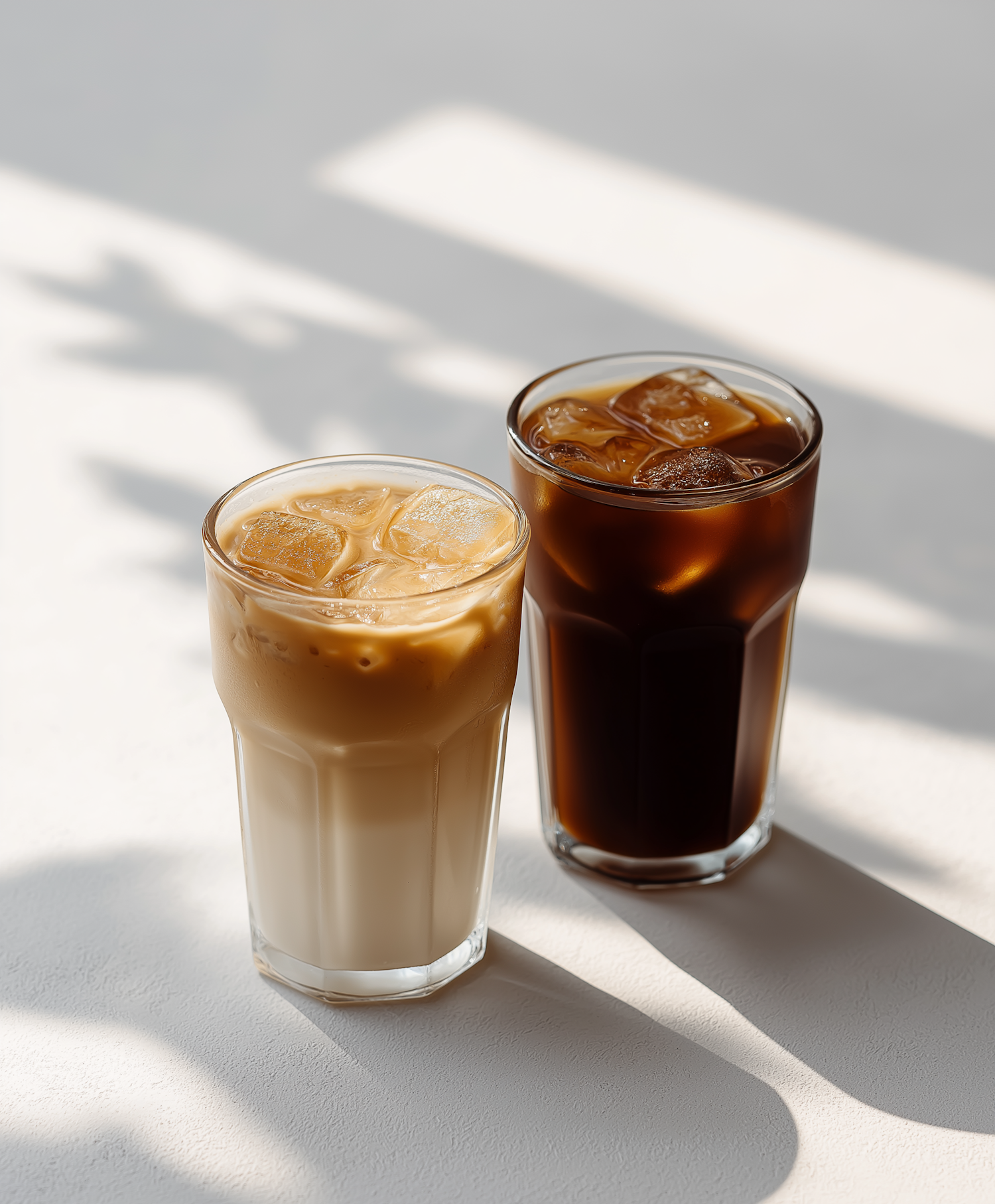 Two refreshing iced coffee drinks, one creamy latte and one black coffee, served in clear glasses with ice on a bright white surface.