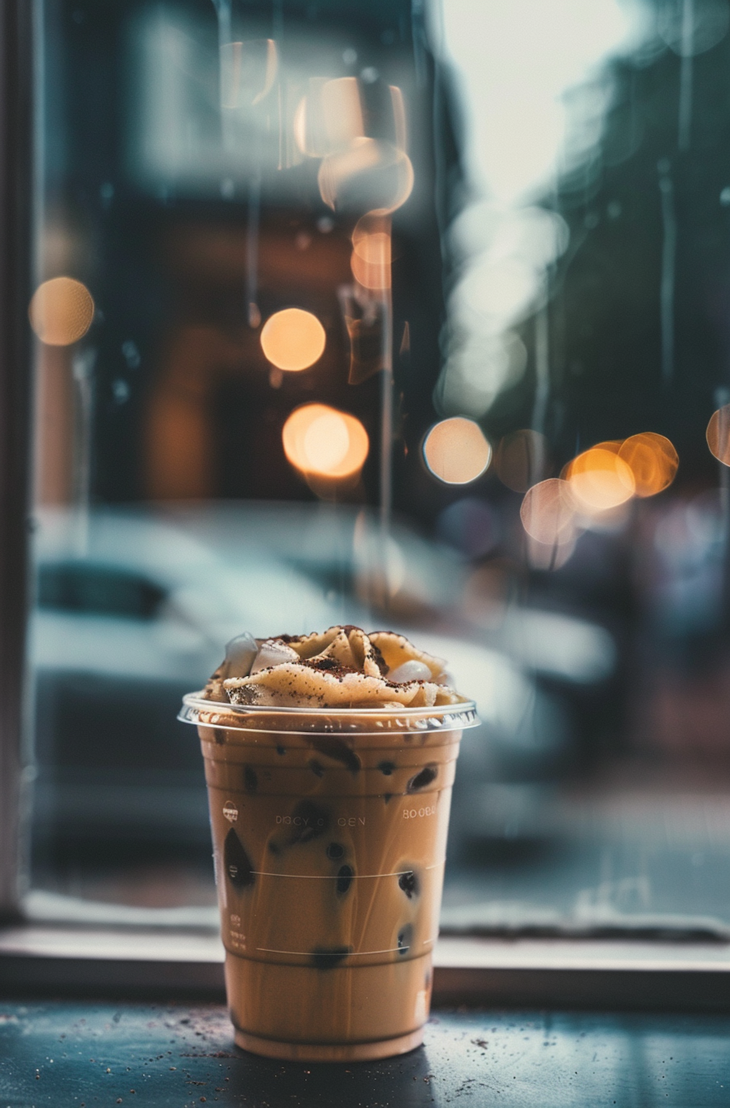 Iced coffee with whipped cream and cocoa on a rainy day, set against a cozy bokeh background.