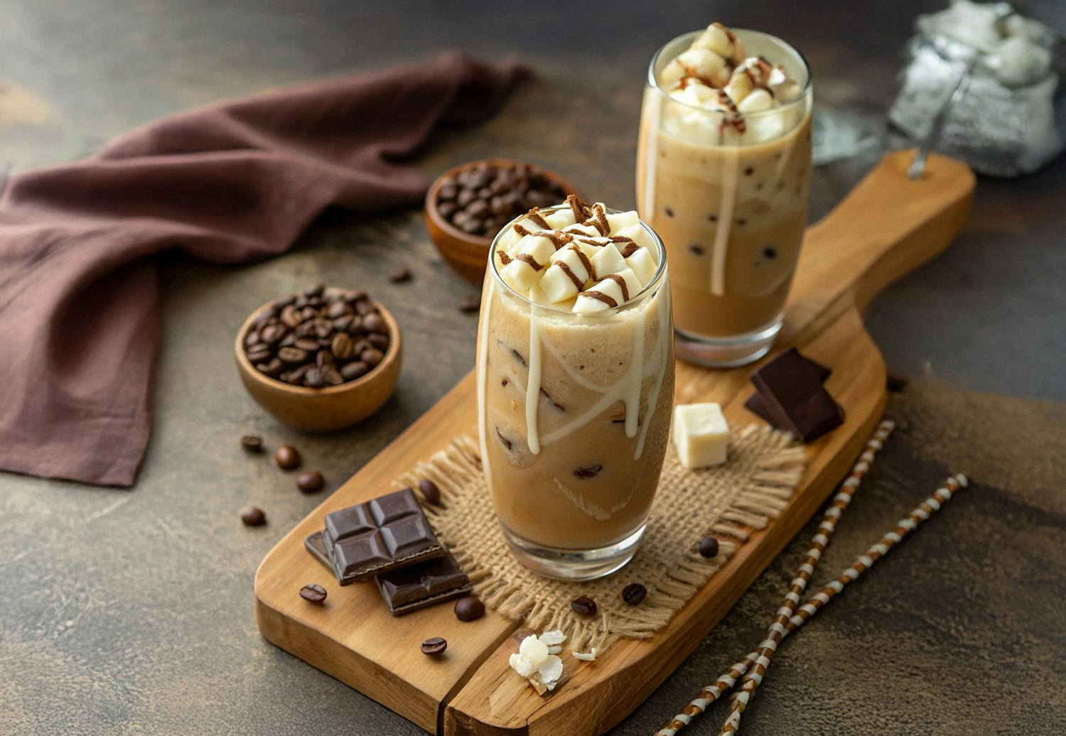 Two iced coffee glasses topped with whipped cream, chocolate drizzle, and white chocolate chunks on a rustic wooden board.