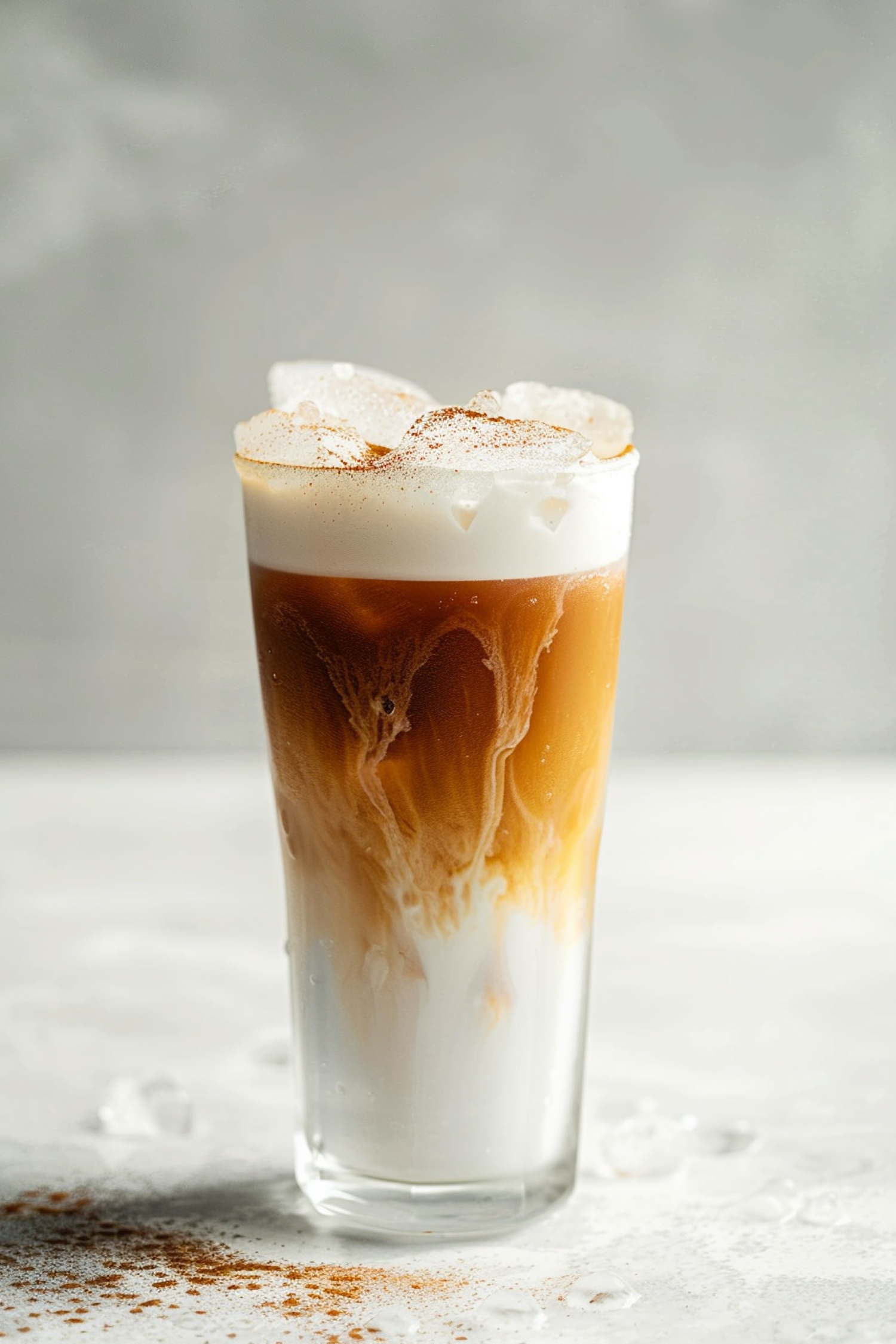 A tall glass of iced coffee with milk, topped with ice cubes and a sprinkle of cinnamon, showcasing a beautiful gradient effect.