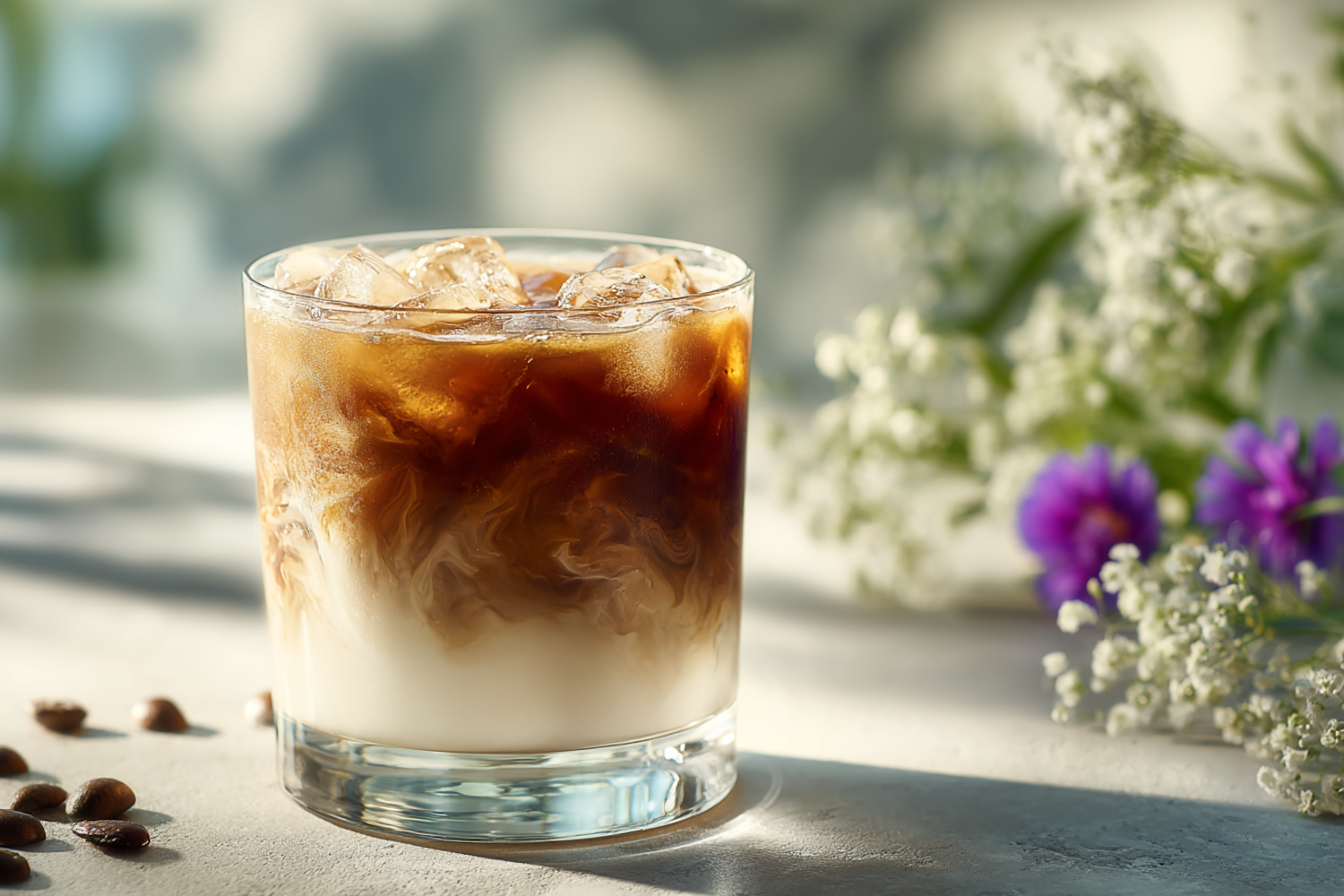 A refreshing iced coffee with milk in a clear glass, surrounded by coffee beans and delicate flowers in a bright, airy setting.
