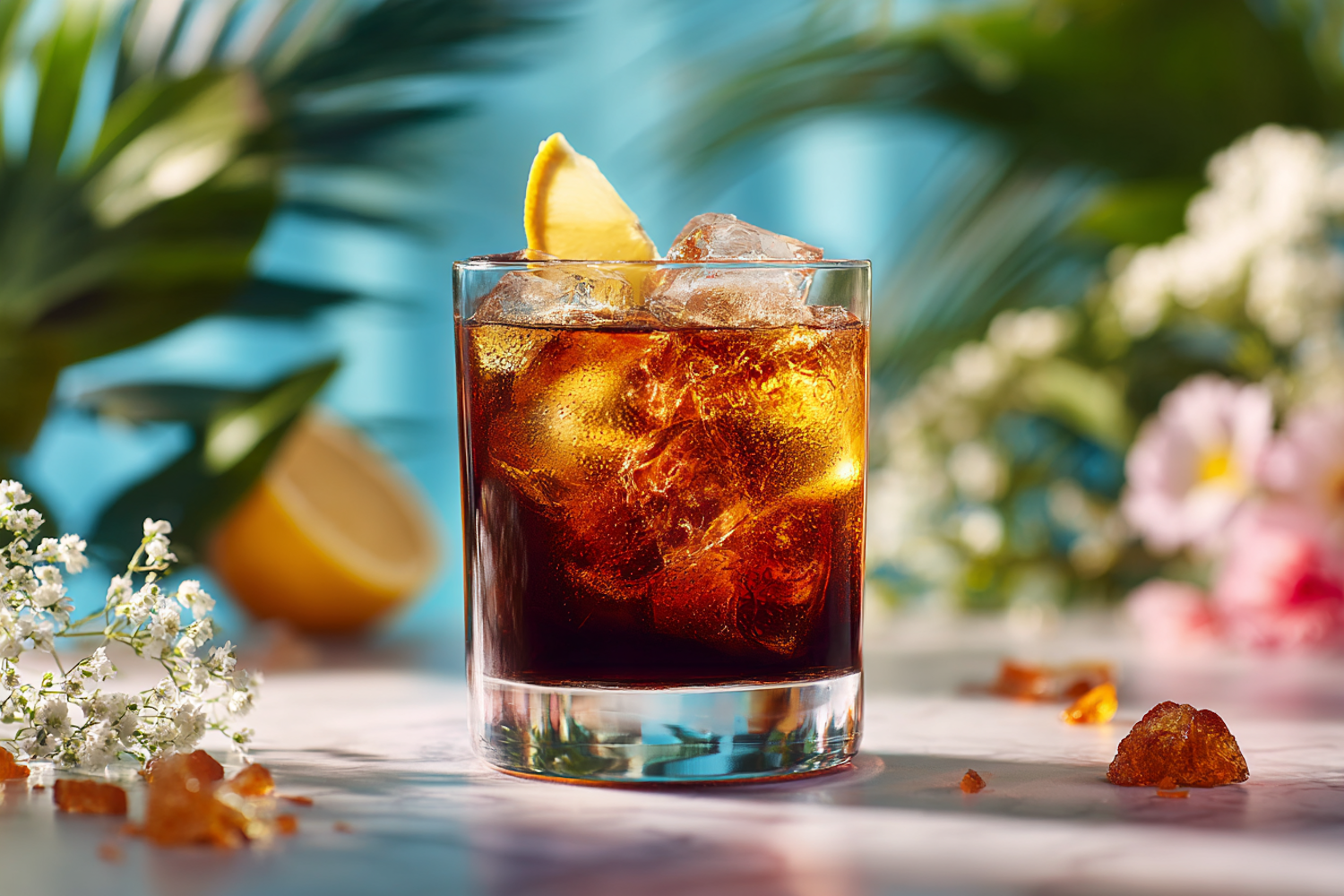 A refreshing iced coffee with lemon garnish, surrounded by tropical decor and flowers, perfect for a summer vibe.