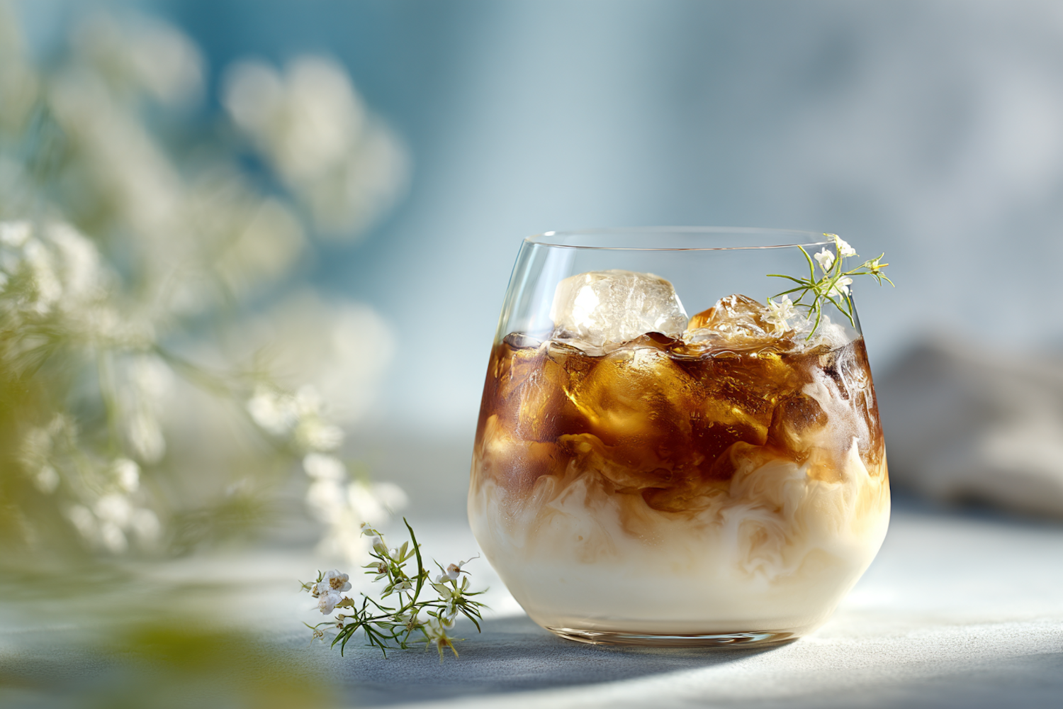 A refreshing iced coffee with milk in a clear glass, surrounded by delicate flowers and soft natural lighting.