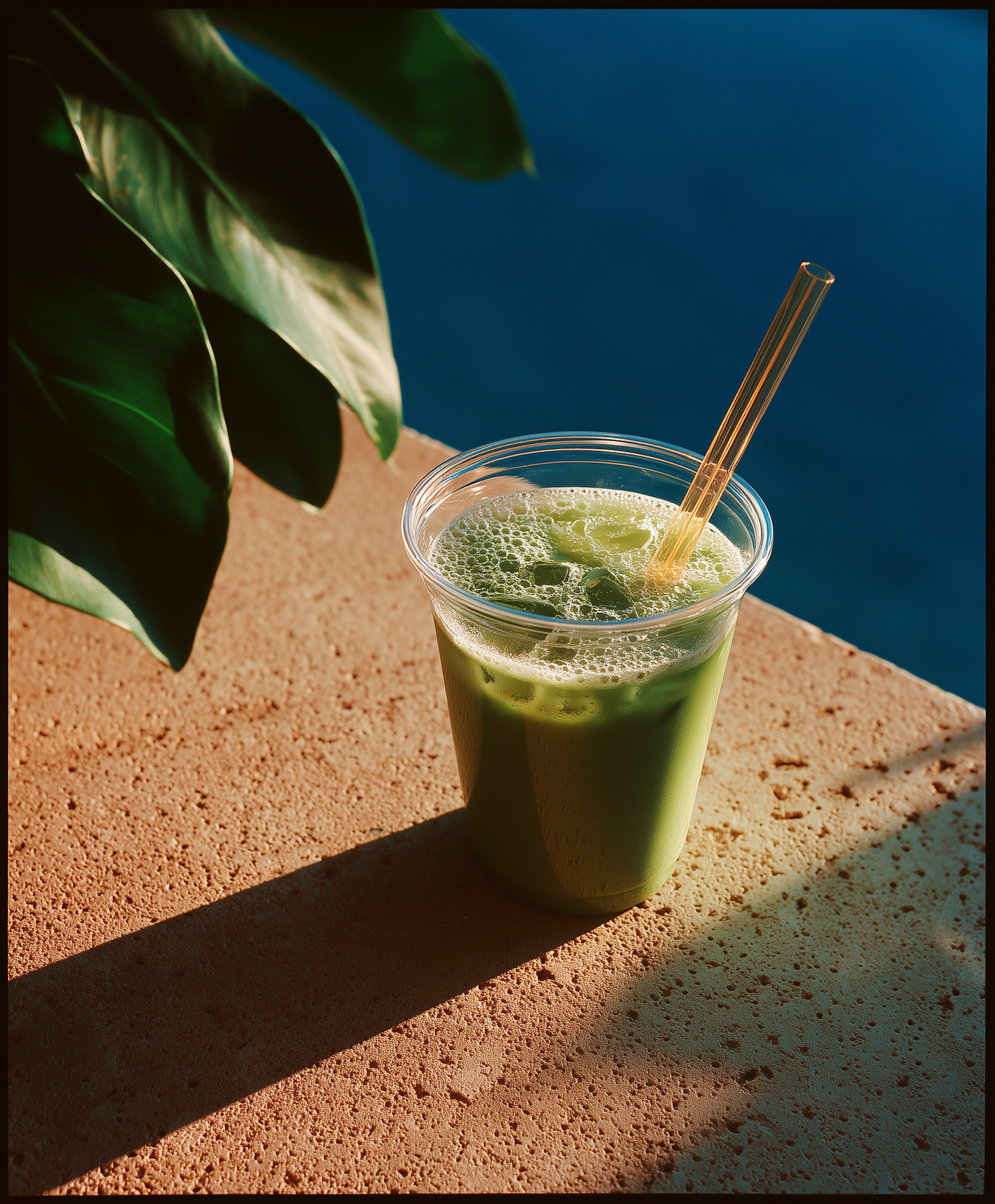 A refreshing green iced drink in a clear cup with a straw, set on a sunlit stone surface with leaves and a blue background.