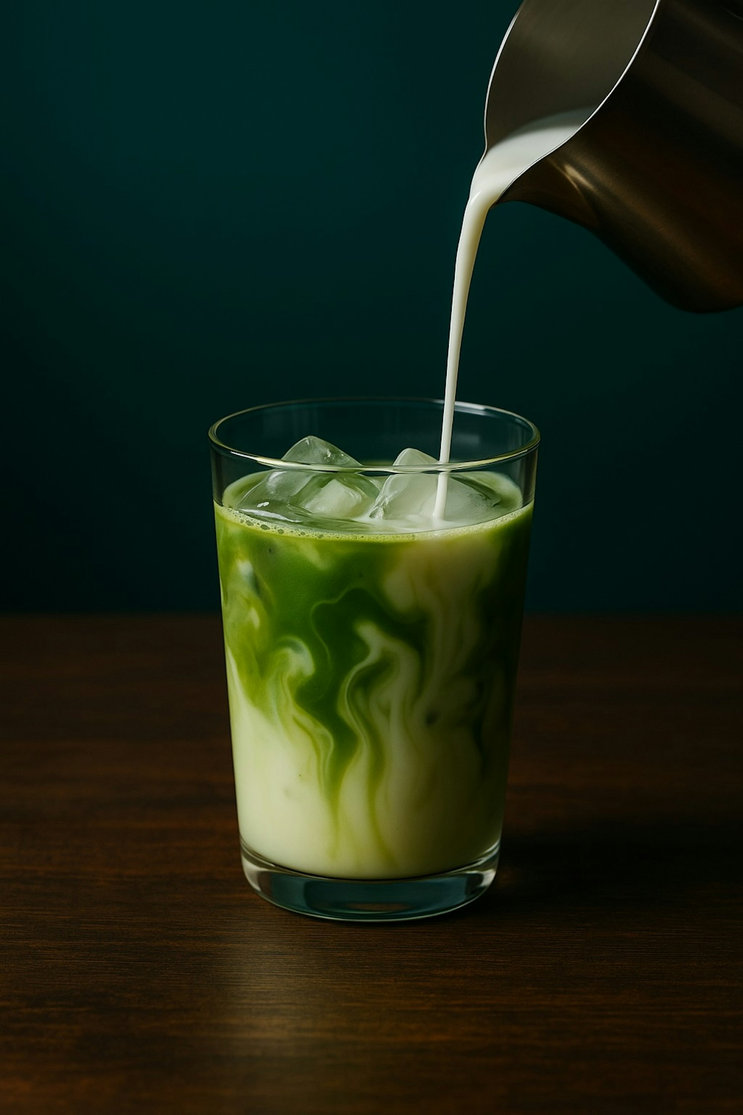 A refreshing iced matcha latte with milk being poured, creating beautiful green and white swirls in a glass filled with ice.