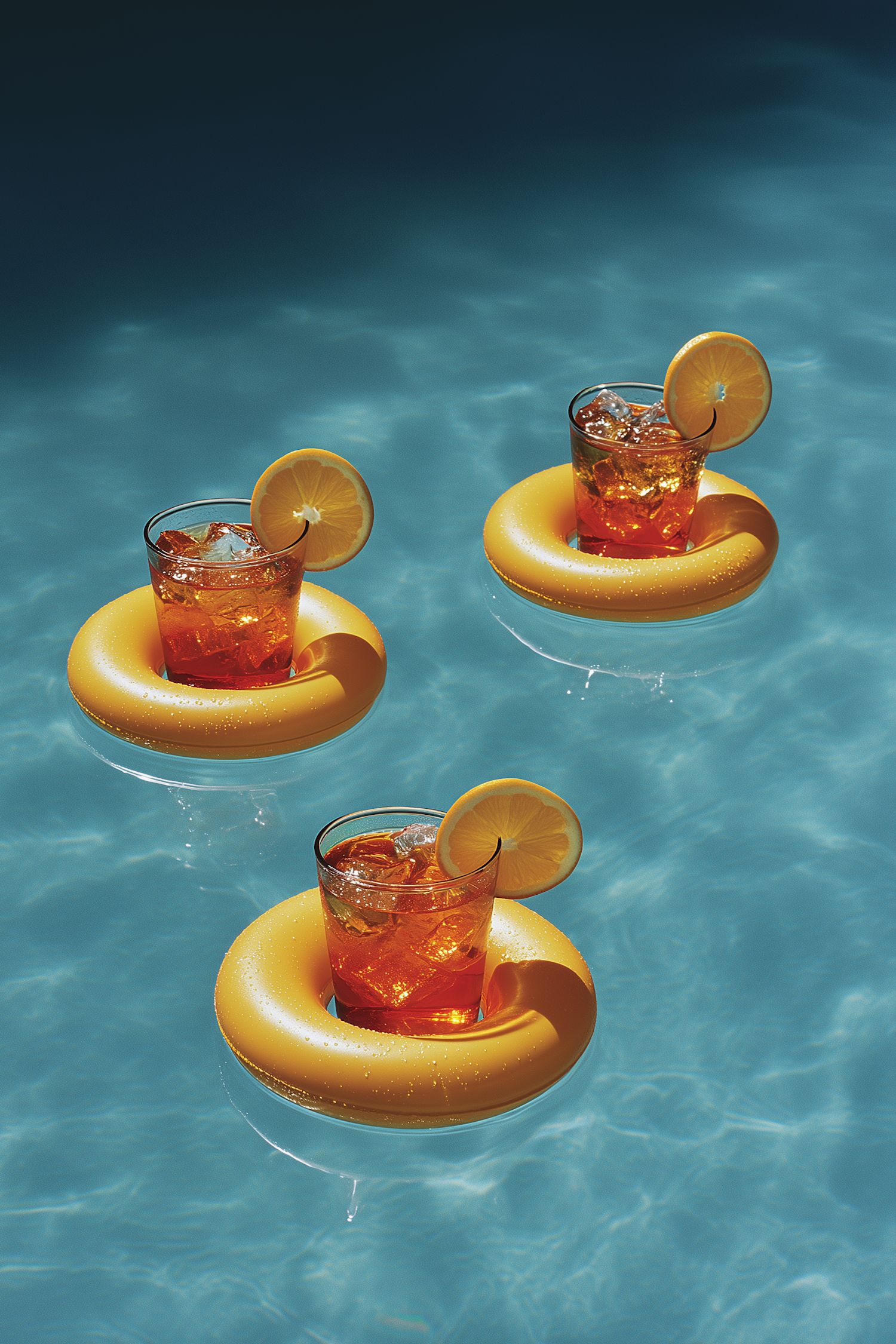 Three glasses of iced tea with lemon slices float on yellow inflatables in a sparkling blue pool, creating a fun summer vibe.