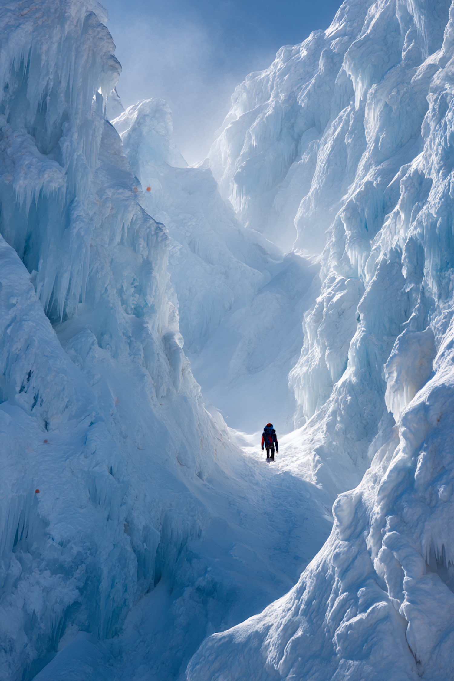A lone climber traverses a stunning icy canyon with towering blue walls, showcasing the beauty and challenge of nature's extremes.