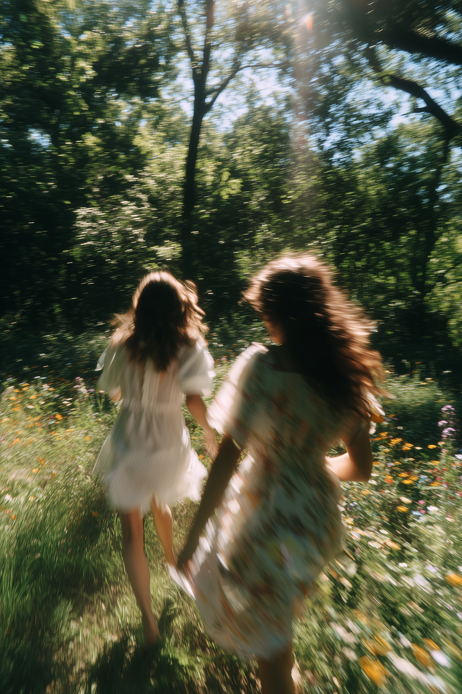Two individuals in light dresses walk through a sunlit meadow with wildflowers, surrounded by lush greenery and dappled sunlight.