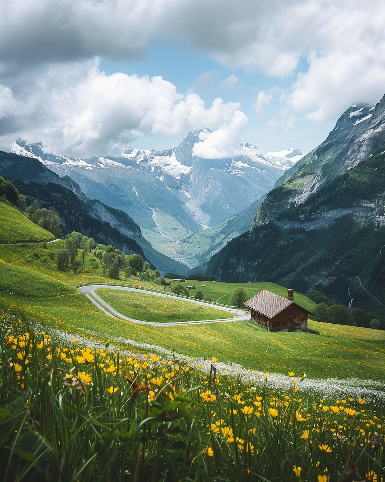 Scenic mountain landscape with a wooden cabin, wildflowers, and snow-capped peaks under a partly cloudy sky.