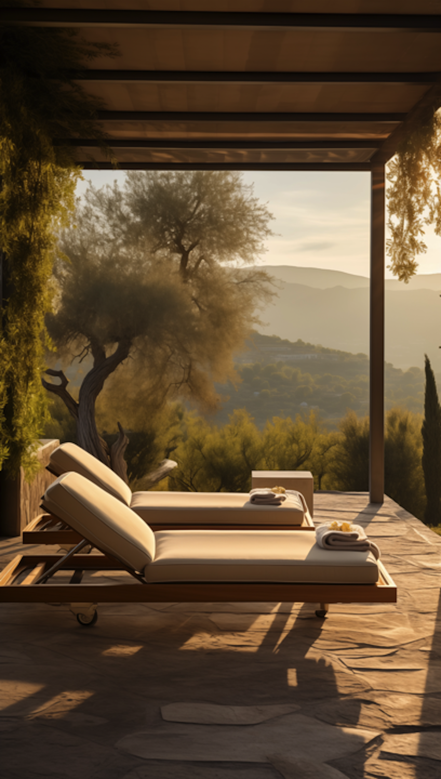 Serene outdoor lounge area with sunlit chairs, towels, and a scenic view of hills and trees under a wooden pergola.