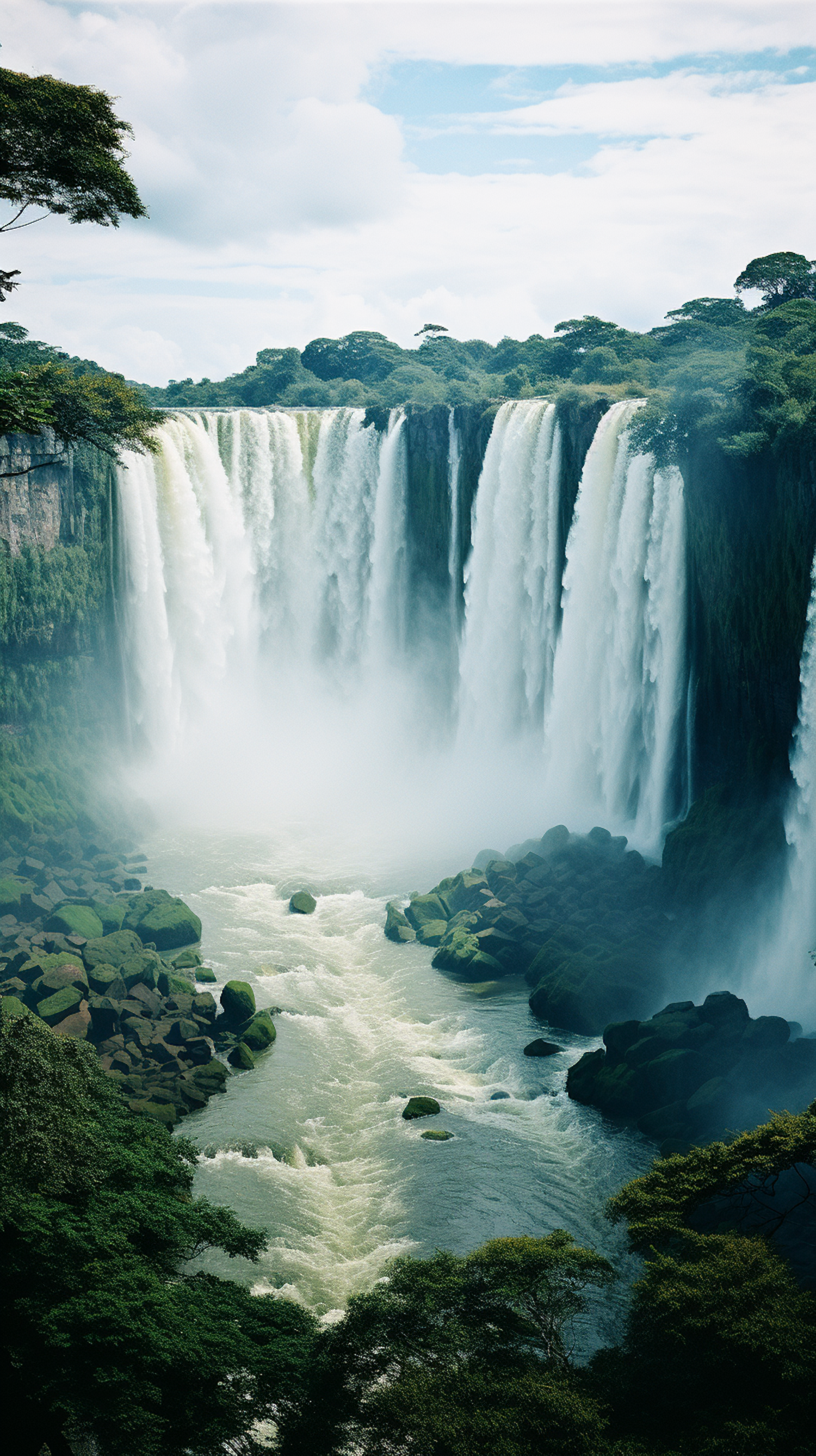 Majestic waterfall with lush greenery and misty spray, surrounded by moss-covered rocks and a partly cloudy sky.