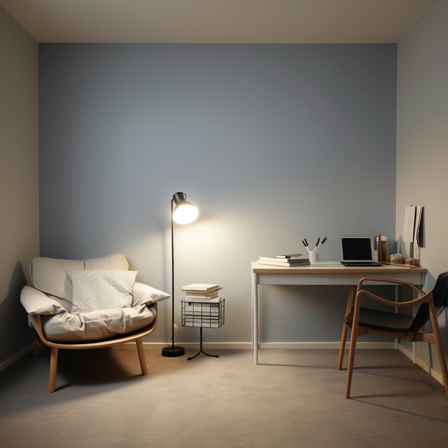 Cozy room with a plush armchair, sleek floor lamp, and minimalist desk setup. Soft colors create a serene ambiance.