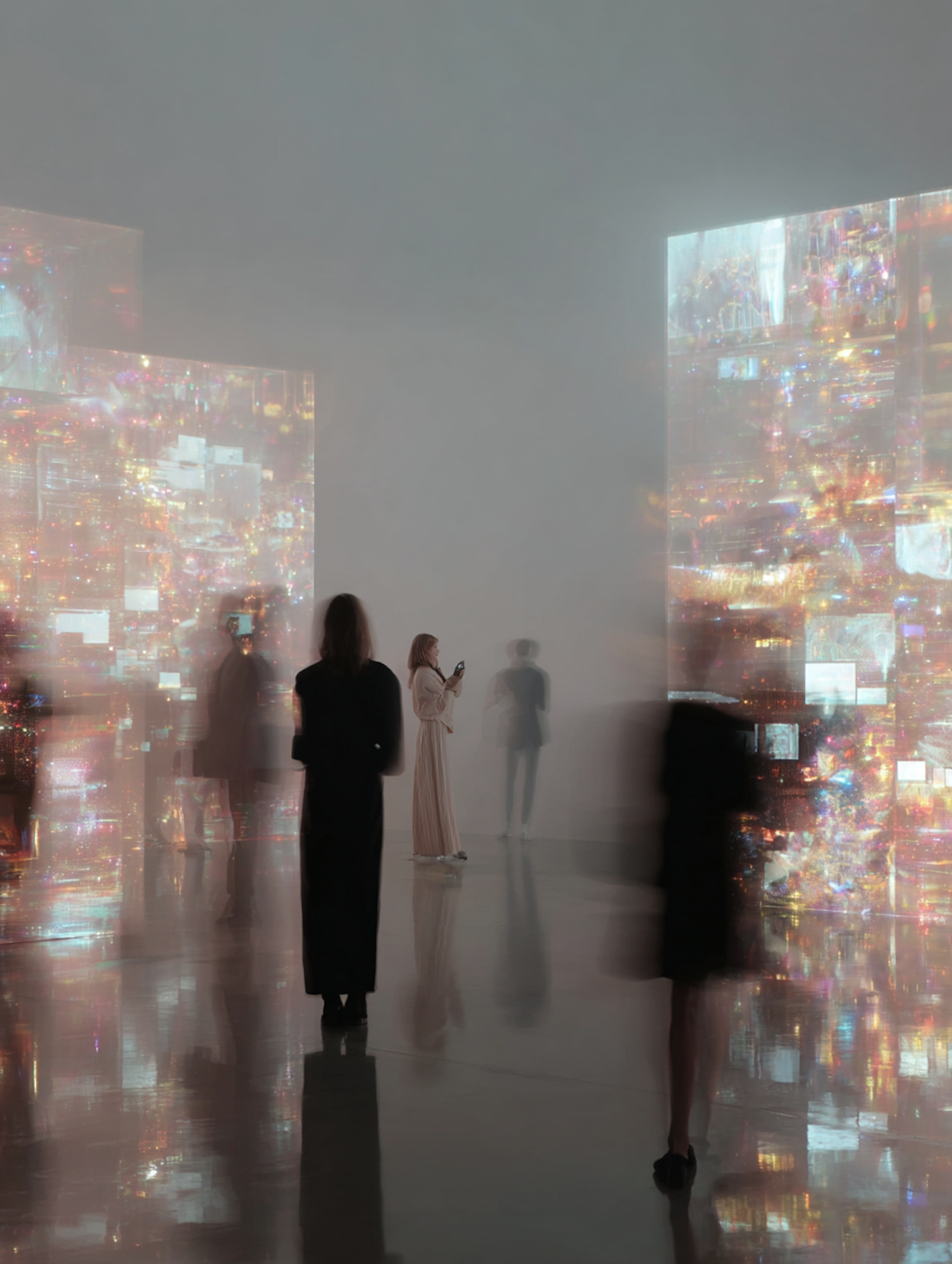 A serene art installation with vibrant digital displays and reflective floors, featuring blurred figures observing the immersive scene.