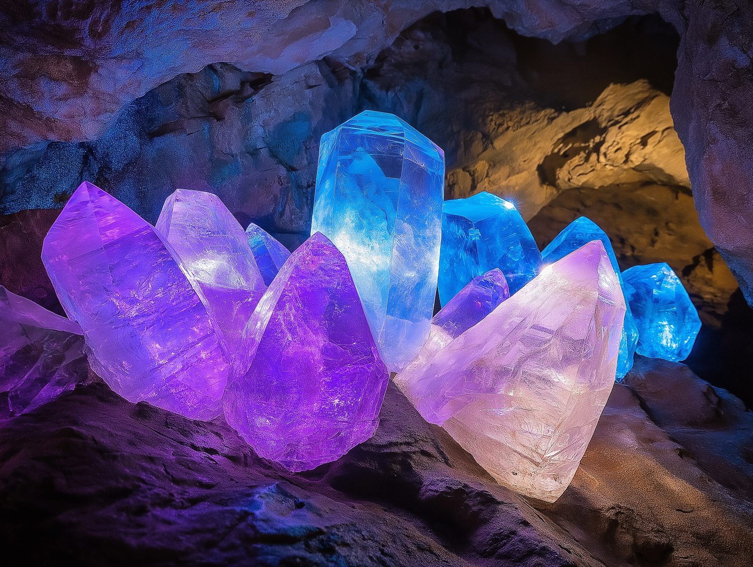 Vibrant purple and blue crystals glowing in a rocky cave, creating a magical and ethereal atmosphere.