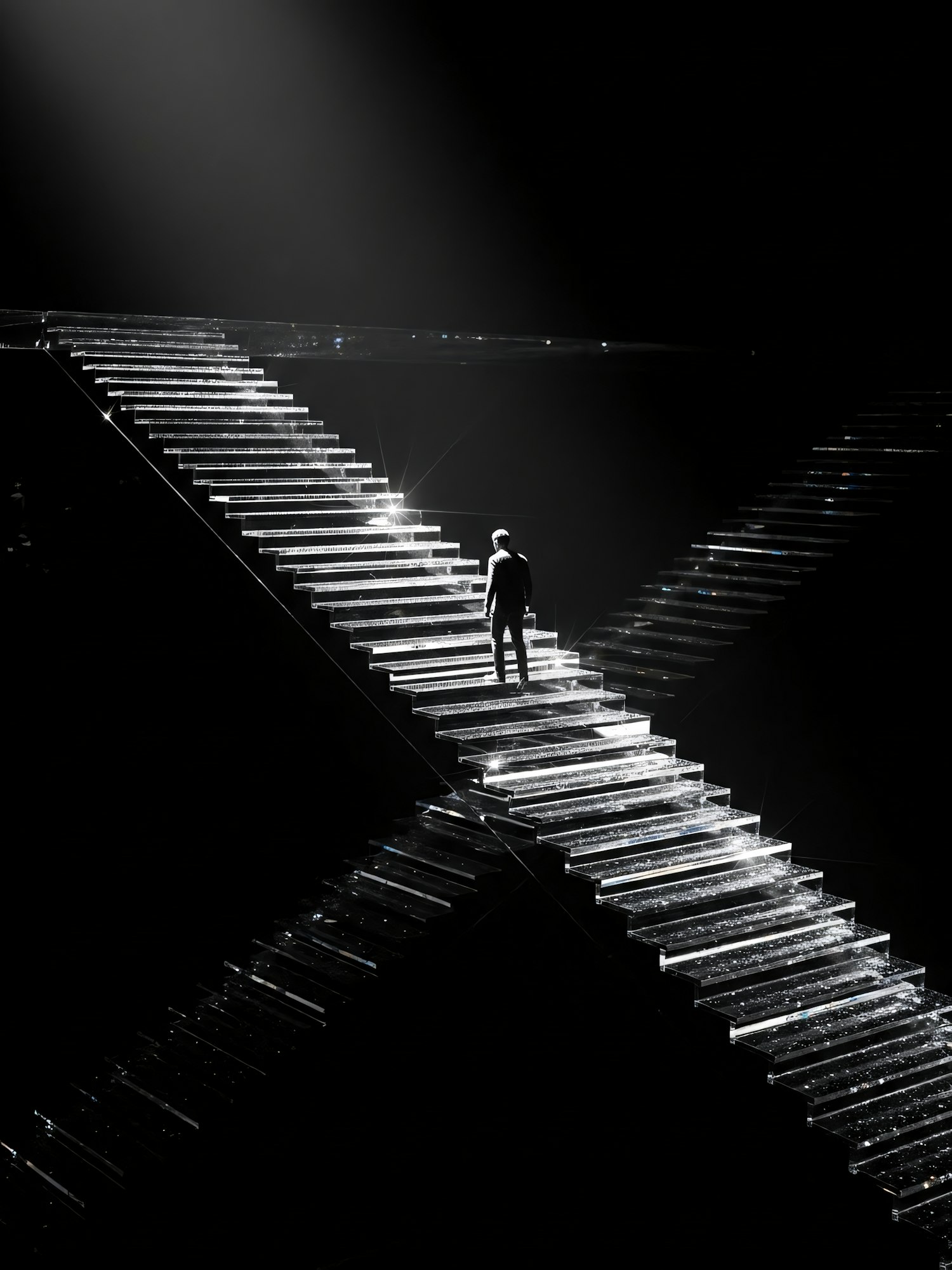 A person ascends glowing, transparent stairs forming an 'X' in a dark, dramatic setting, creating a surreal and contemplative atmosphere.