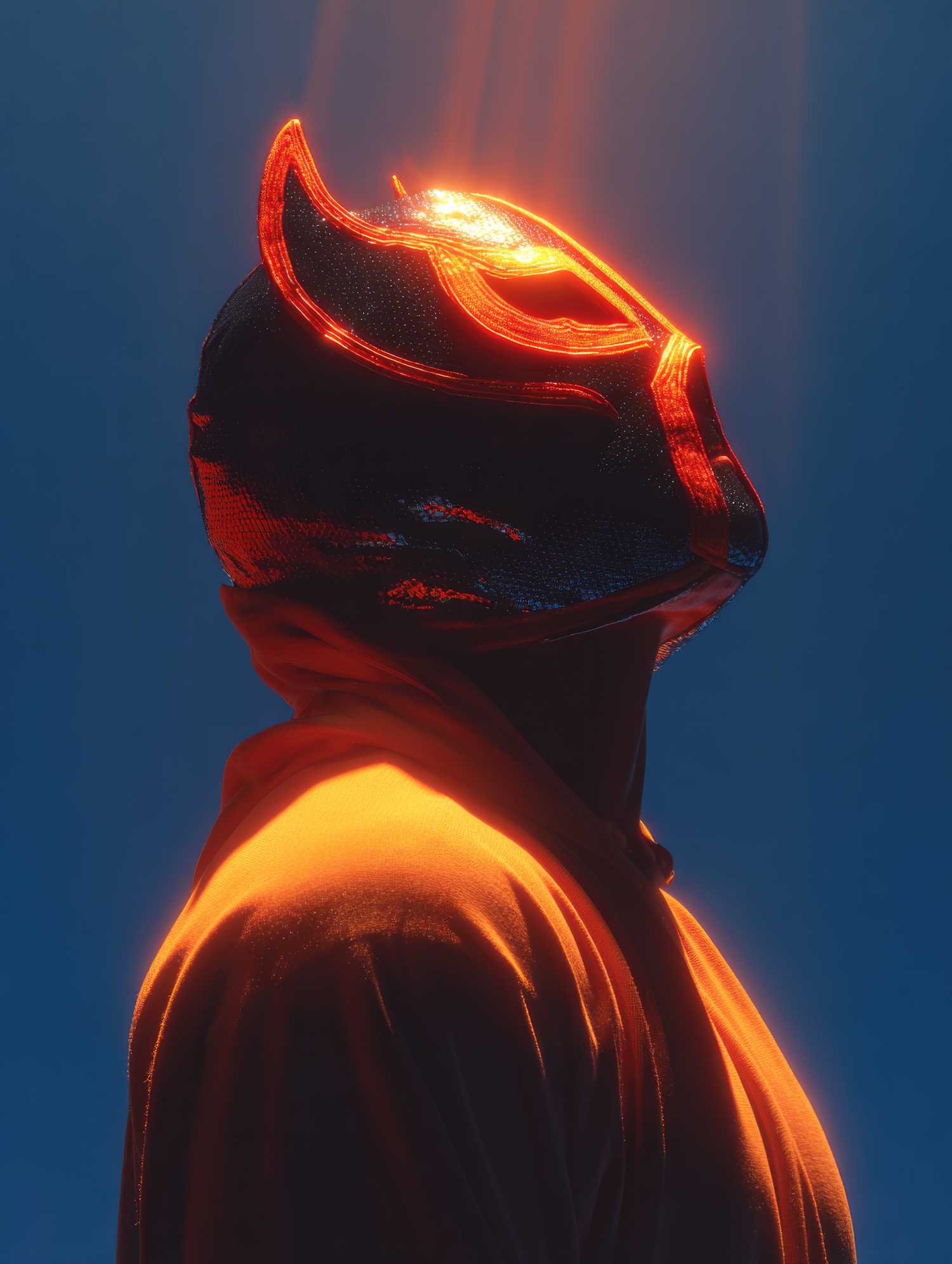 A captivating image of a glowing mask with an orange hue against a dark blue background, evoking mystery and vivid visual contrast.