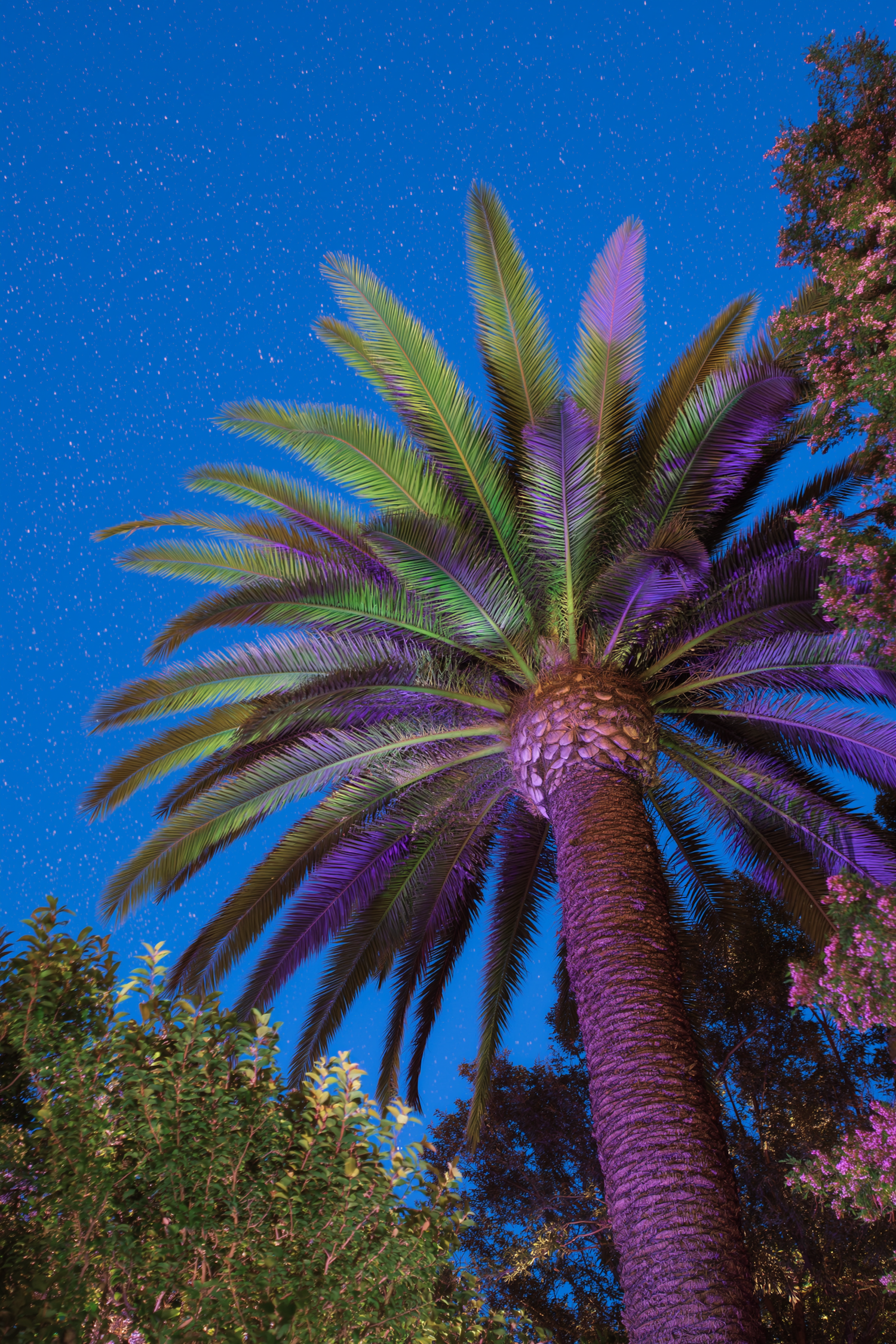 Vividly lit tall colorful palm trees against a starry night sky, with purple and blue hues enhancing the tropical ambiance and natural textures.