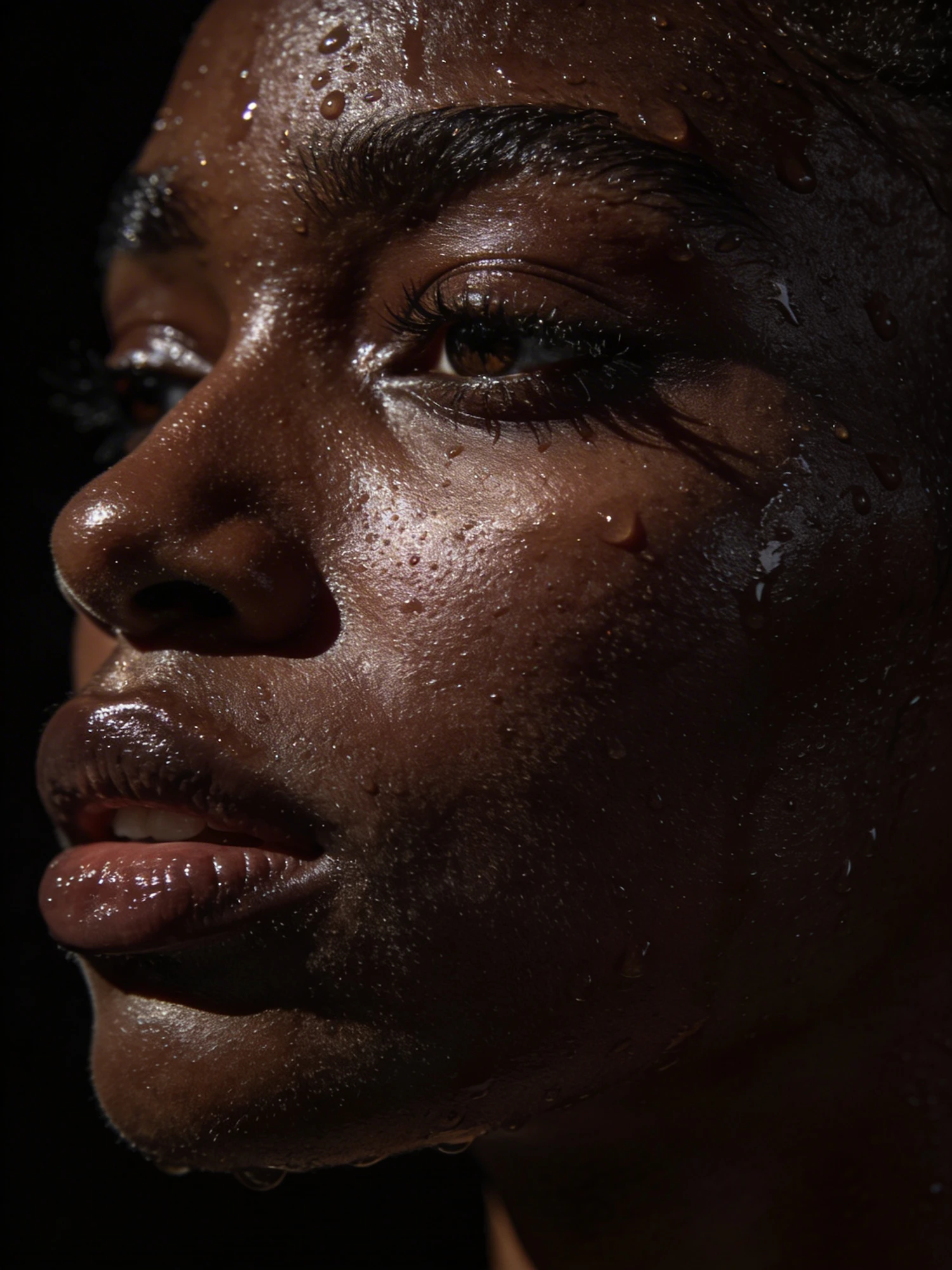 xtreme close-up portrait of a dark-skinned face, deep rich dark-skinned, very dark complexion, melanated skin, even skin tone, detailed natural skin texture, no overexposure, with water droplets on skin, dramatic side lighting, glossy highlights, deep shadows, high detail pores, cinematic beauty photography, black background, 85mm lens, ultra realistic
