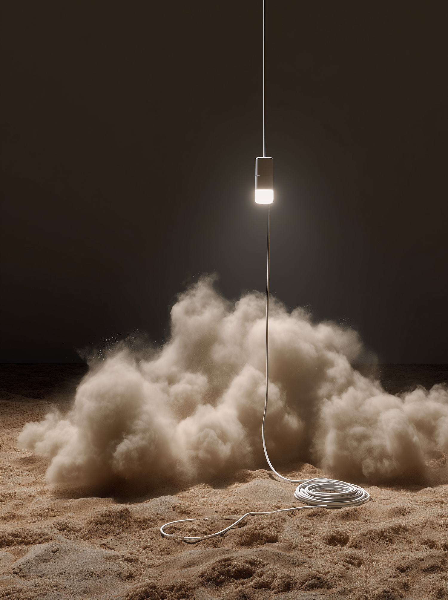 A suspended light illuminates a sandy surface with a coiled cable, creating a dramatic scene with rising dust and a dark background.