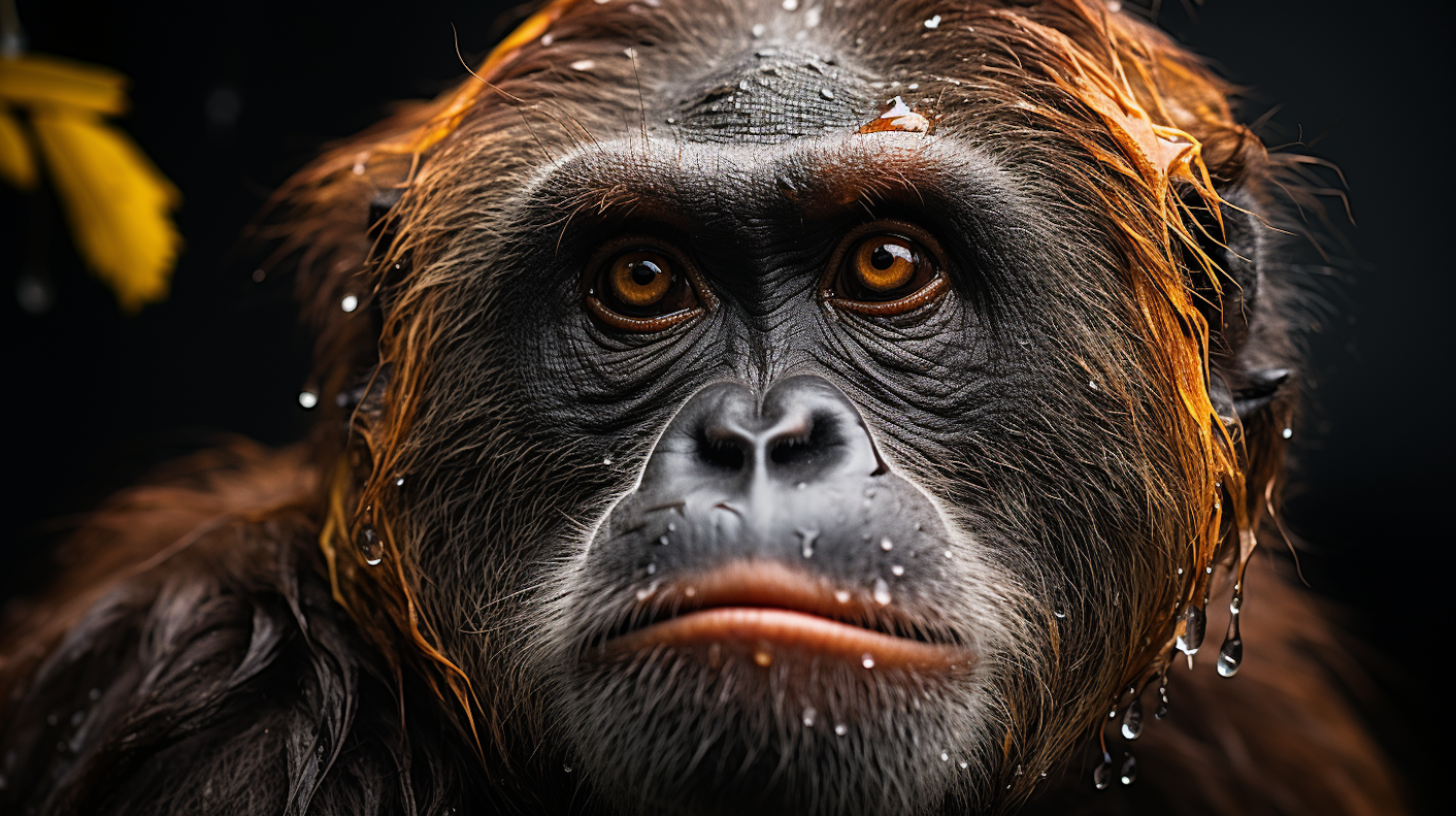 Close-up of an orangutan with water droplets on its fur, showcasing its intense gaze and rich brown-orange hues.