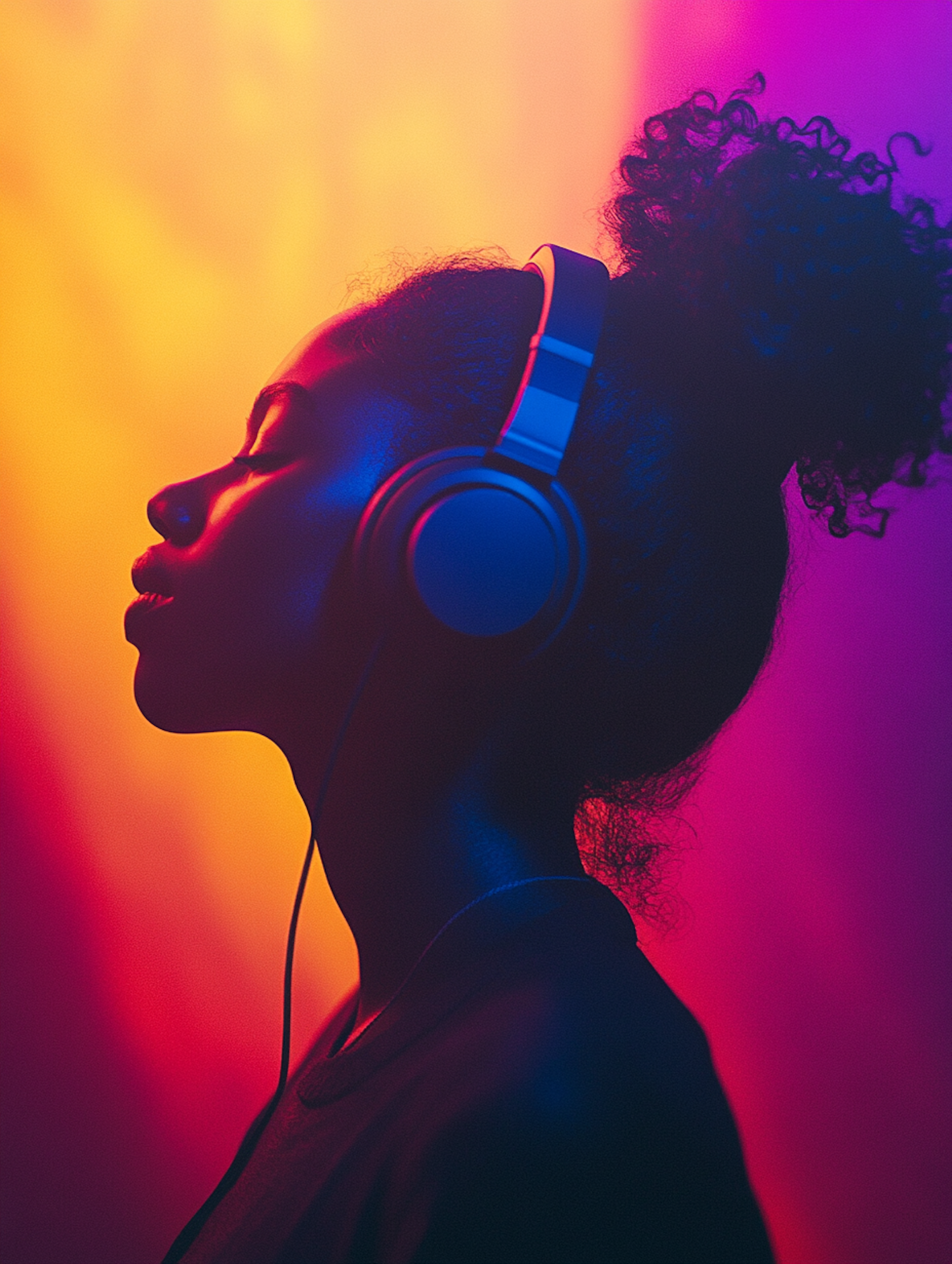 A serene side profile of a woman with headphones, set against a vibrant gradient of orange, pink, and purple hues.