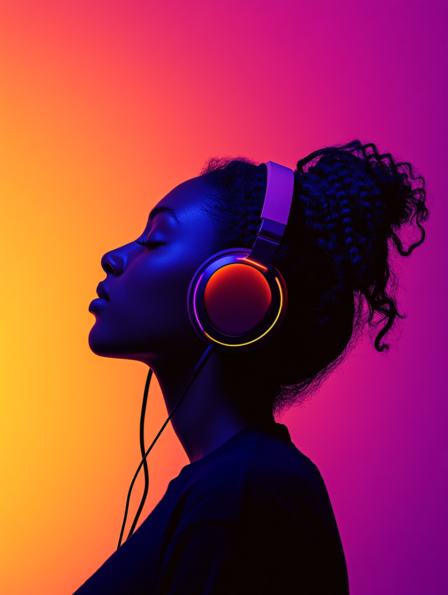 A serene profile of a woman with glowing headphones against a vibrant orange-to-magenta gradient background.