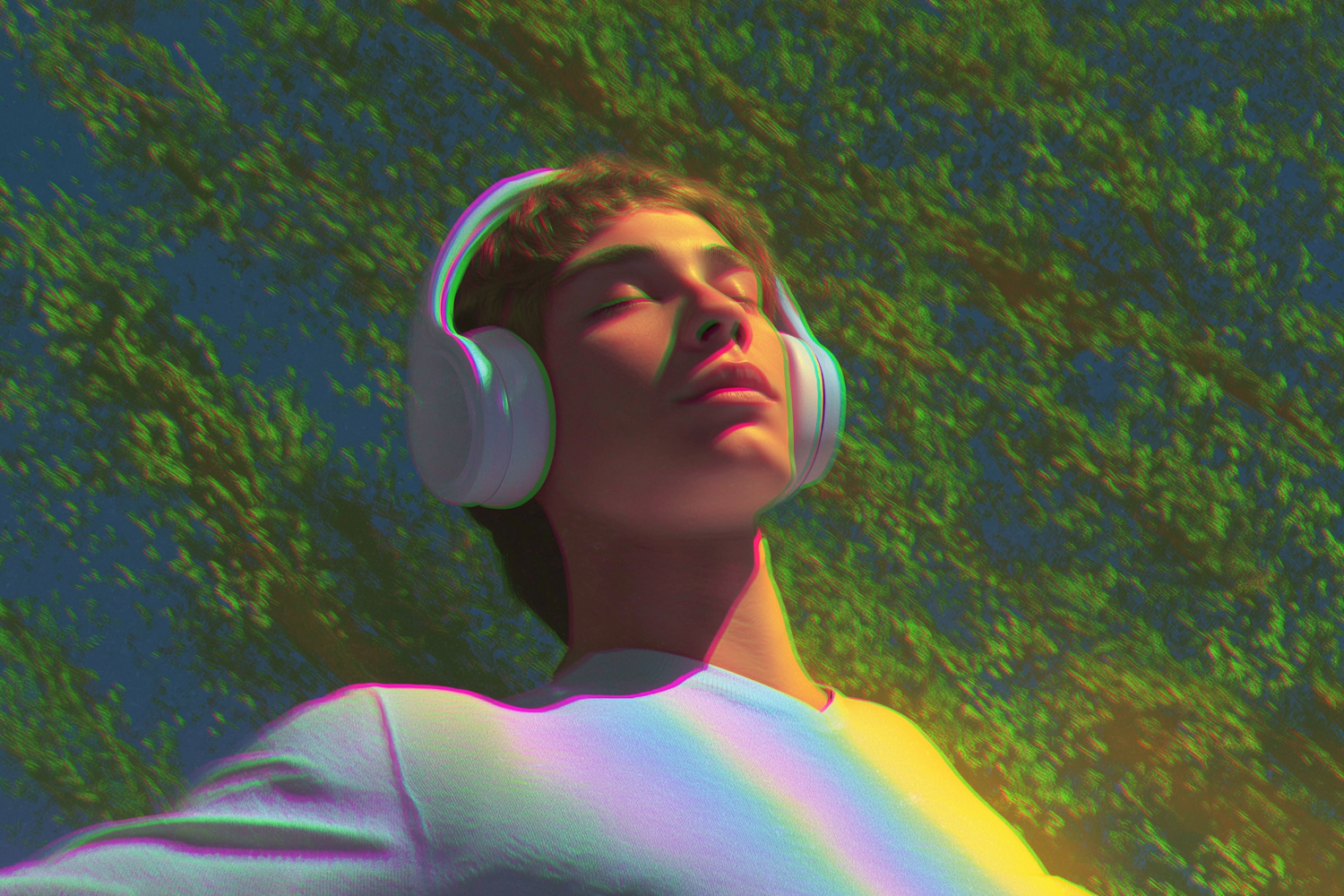 A person with headphones enjoys music, surrounded by a vibrant, abstract background of green and blue hues.