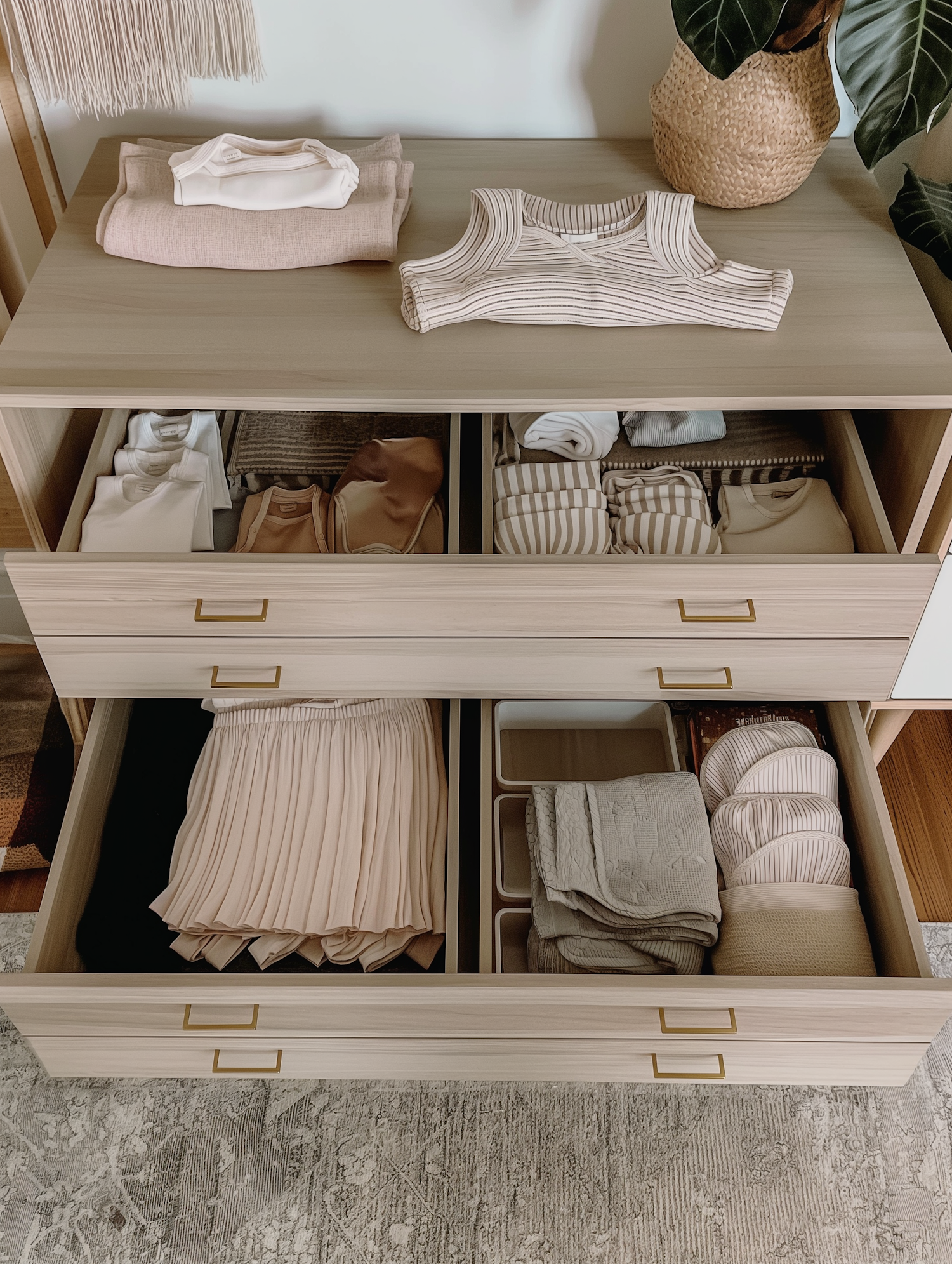 Neatly organized dresser with folded clothes in neutral tones, featuring a woven basket with a plant and a textured gray rug.