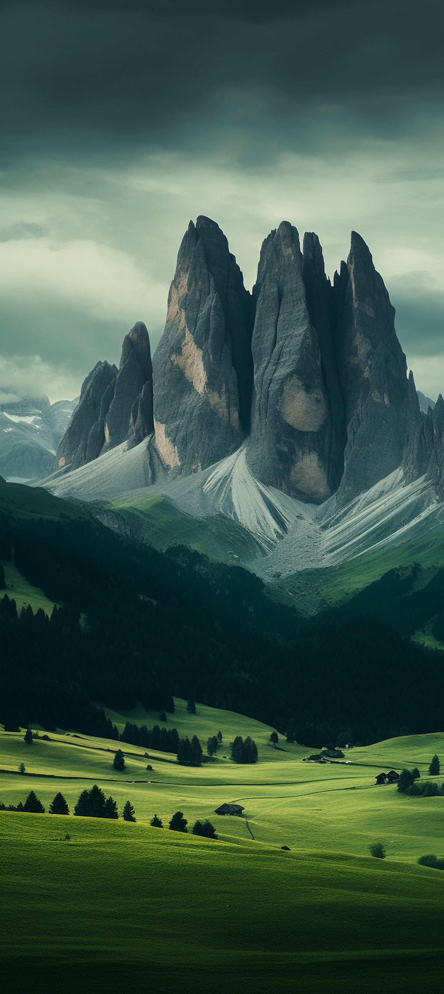 Majestic jagged peaks under a moody sky, with lush green meadows and rustic cabins creating a serene yet dramatic landscape.