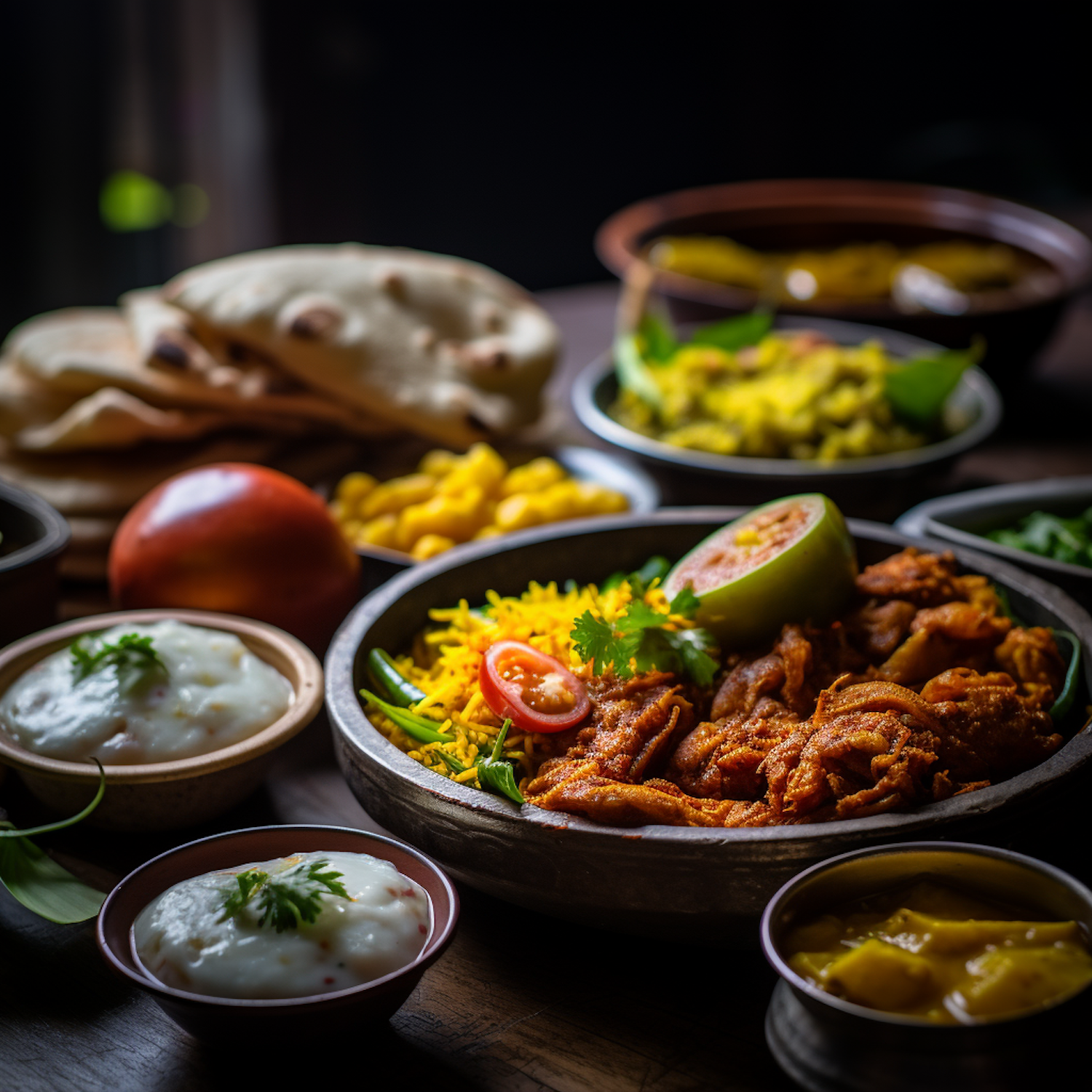 A colorful spread of Indian cuisine with spicy chicken curry, yellow rice, naan, and various side dishes on a wooden table.