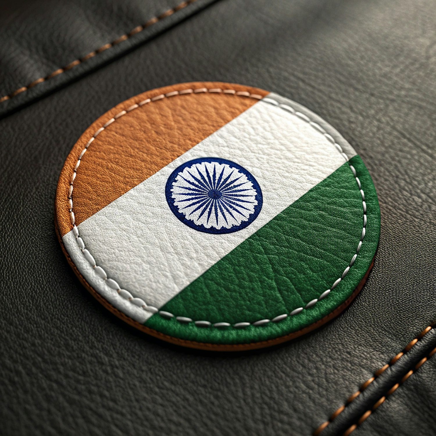 Circular leather patch with the Indian flag design, stitched onto a dark leather surface, showcasing detailed textures and vibrant colors.
