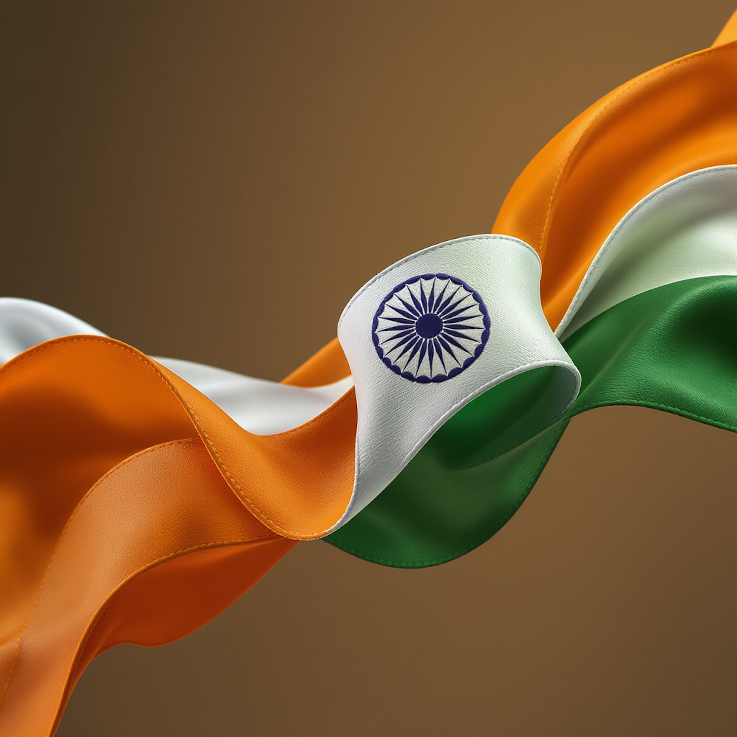 A vibrant depiction of the Indian flag with its saffron, white, and green stripes and the Ashoka Chakra, set against a warm brown background.