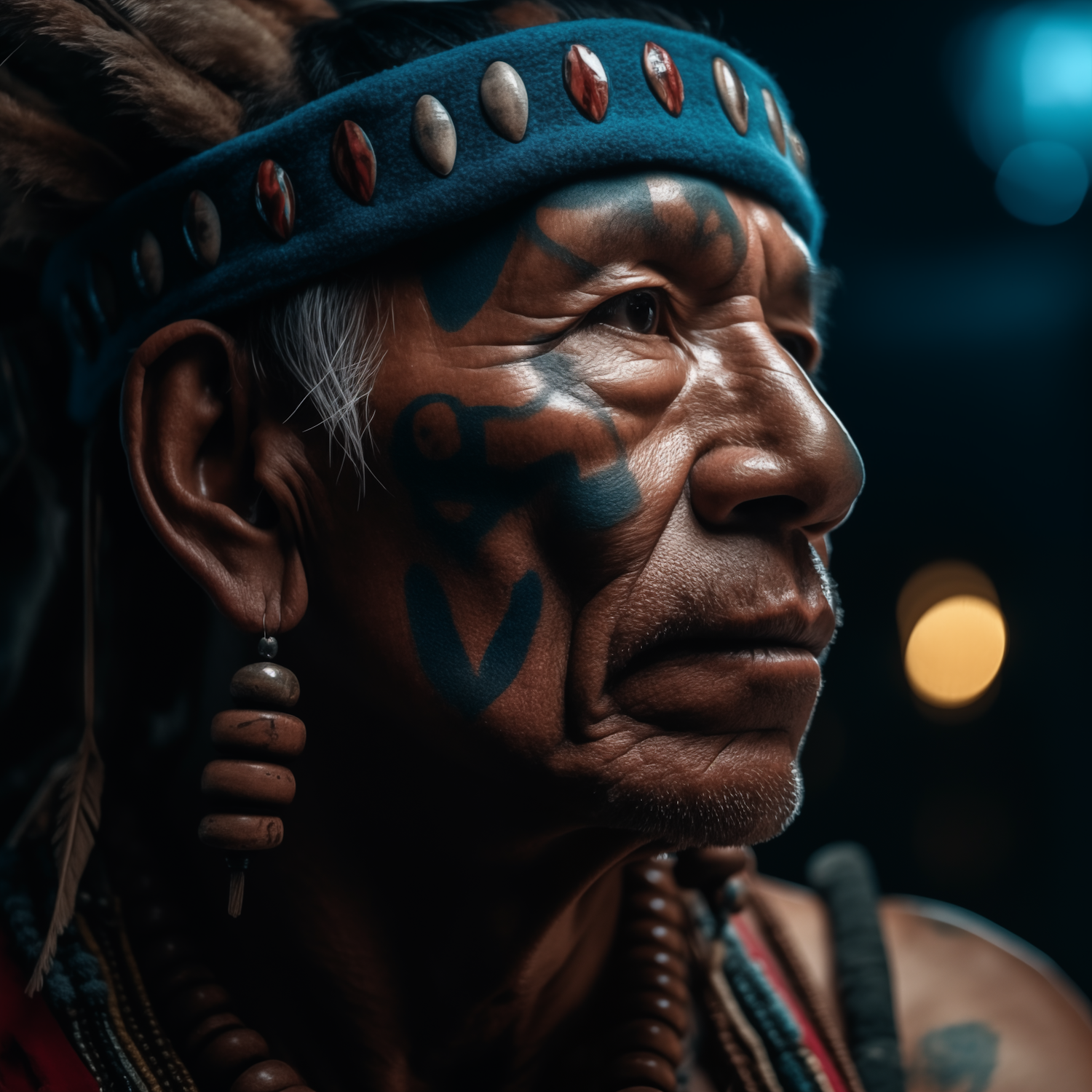 Elderly Native American man with blue face paint, wearing a beaded headband and wooden earrings, gazes thoughtfully in a dimly lit setting.
