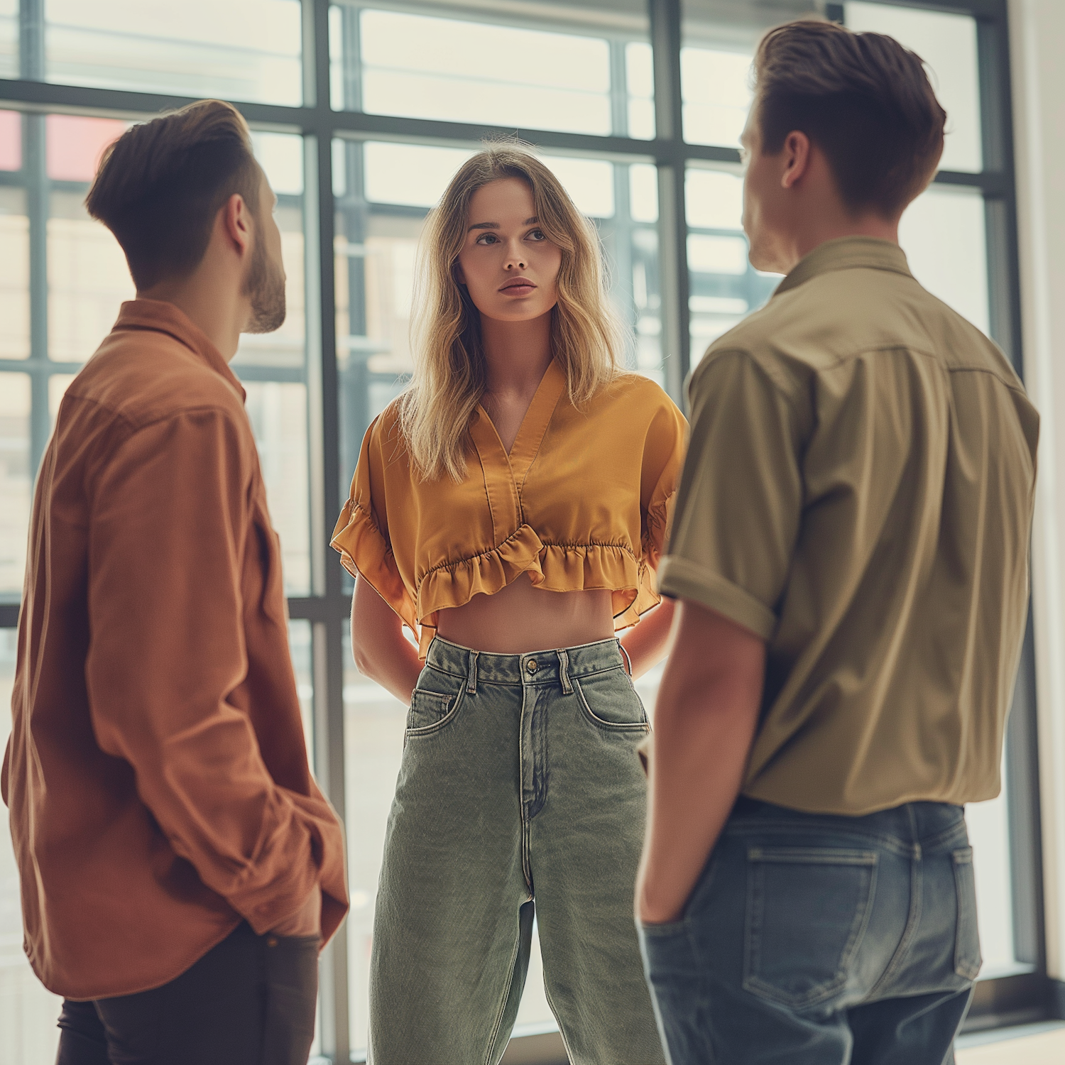 Three young adults in casual attire engage in conversation in a bright room with large windows.