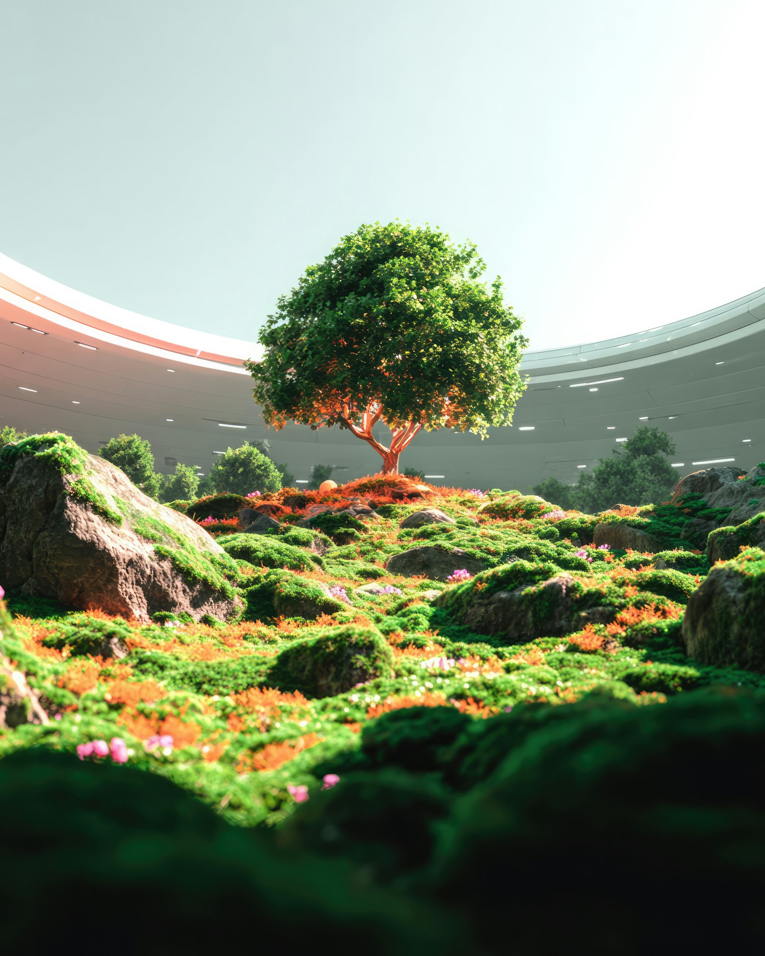 A vibrant indoor landscape with a central tree, mossy rocks, and colorful flowers under a futuristic dome structure.