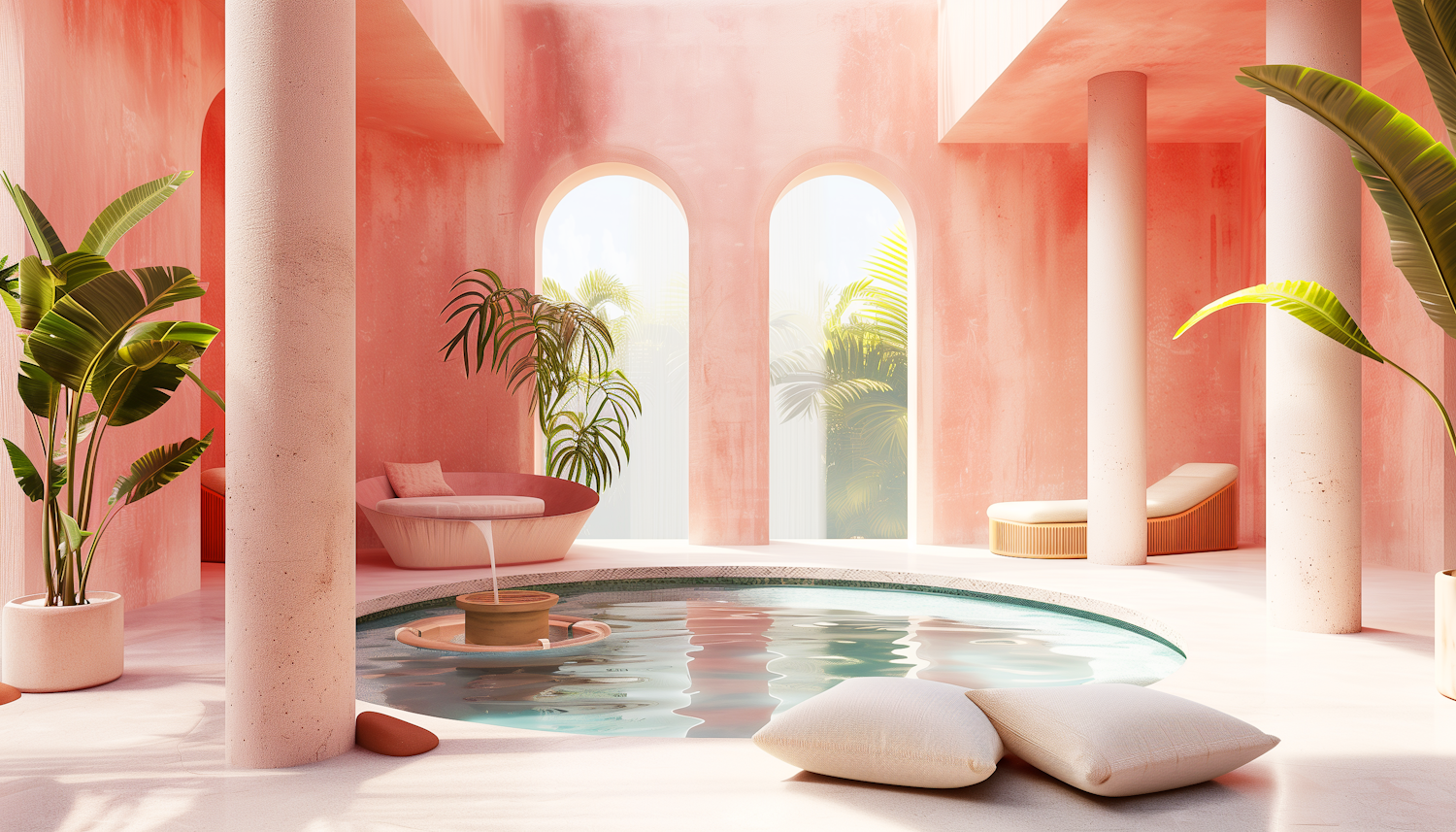 Serene indoor space with pink walls, circular pool, white columns, and lush plants. Natural light creates a tranquil, inviting atmosphere.
